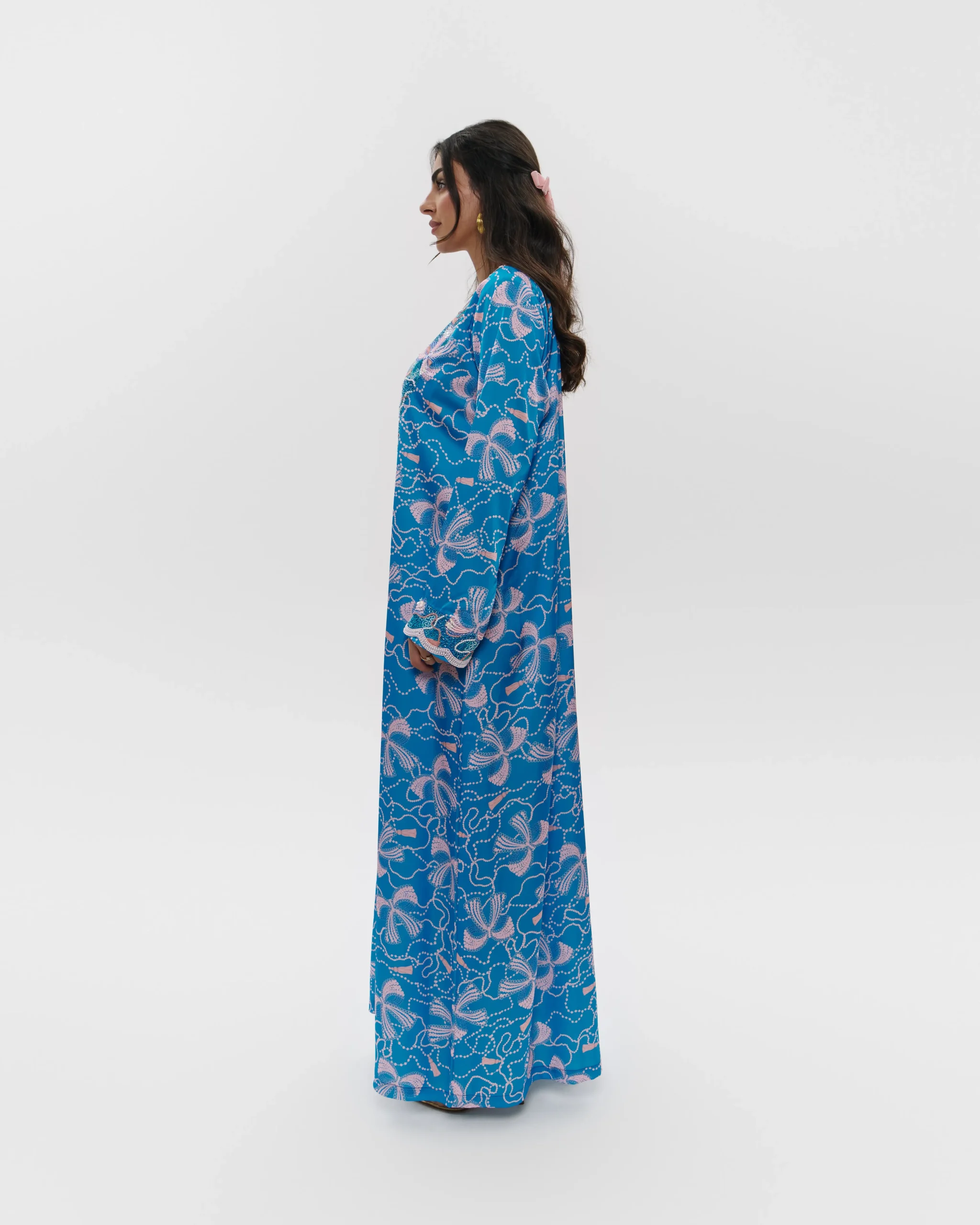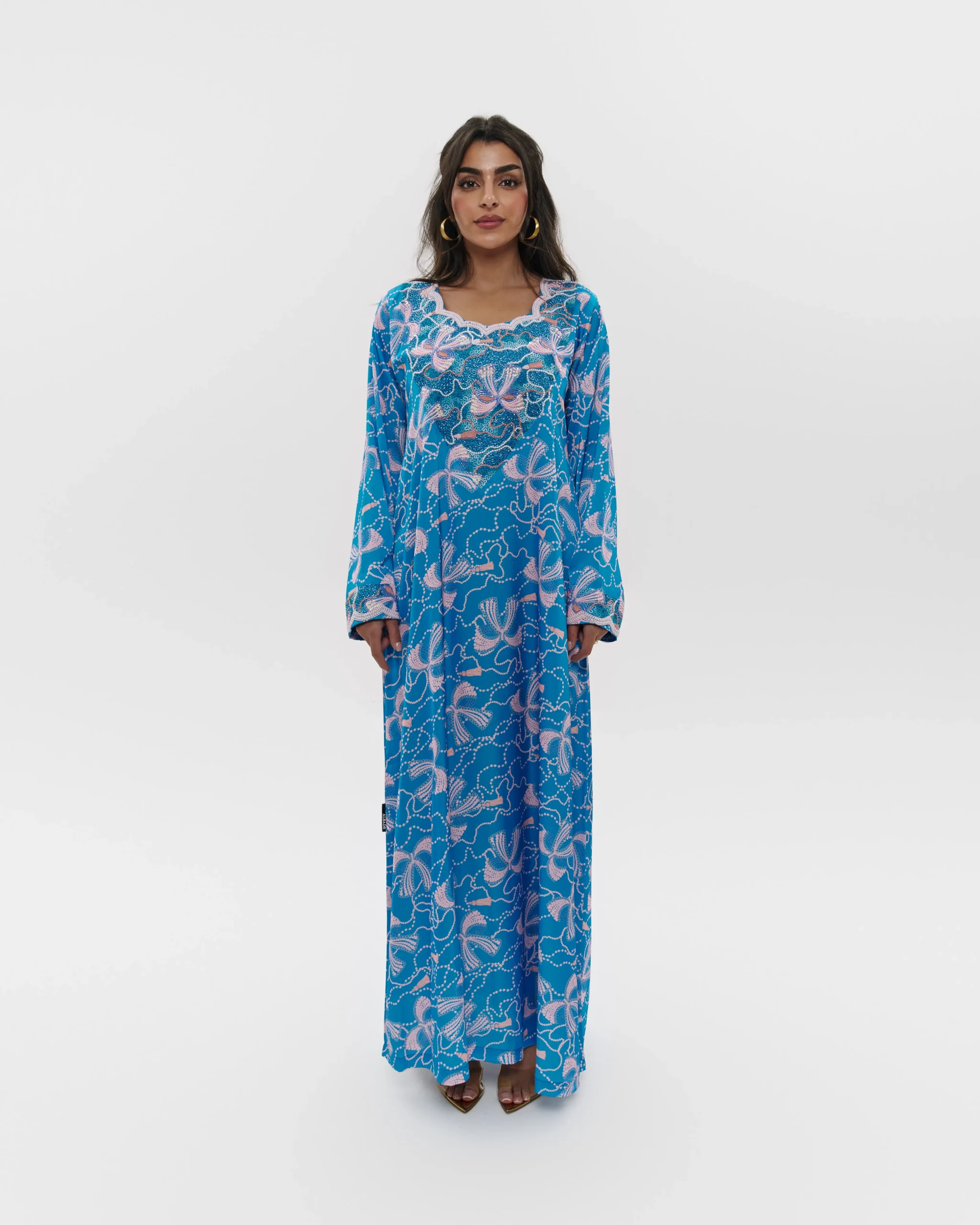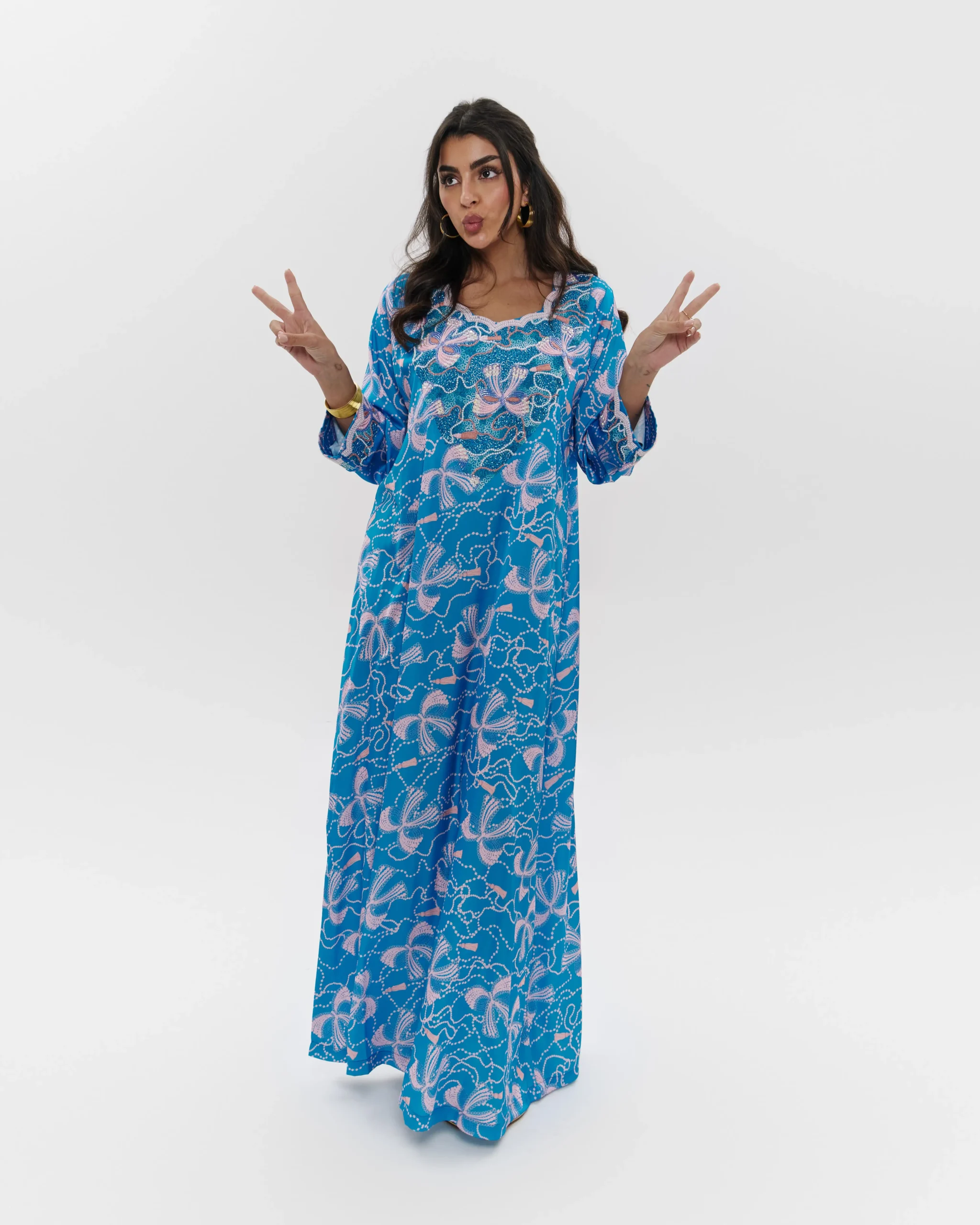 Blue loose-fitted jalabiyah with blue and pink embroidery. Baby pink ribbons pattern and baby pink neck and cuff piping.