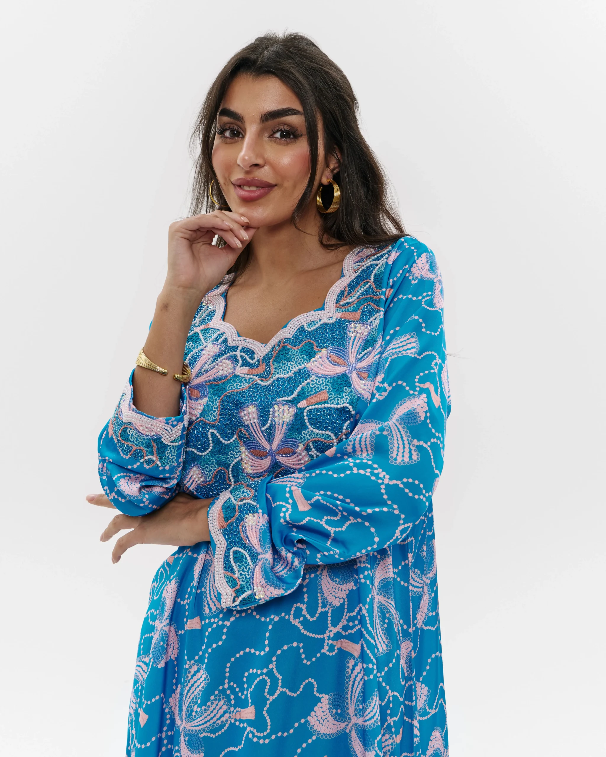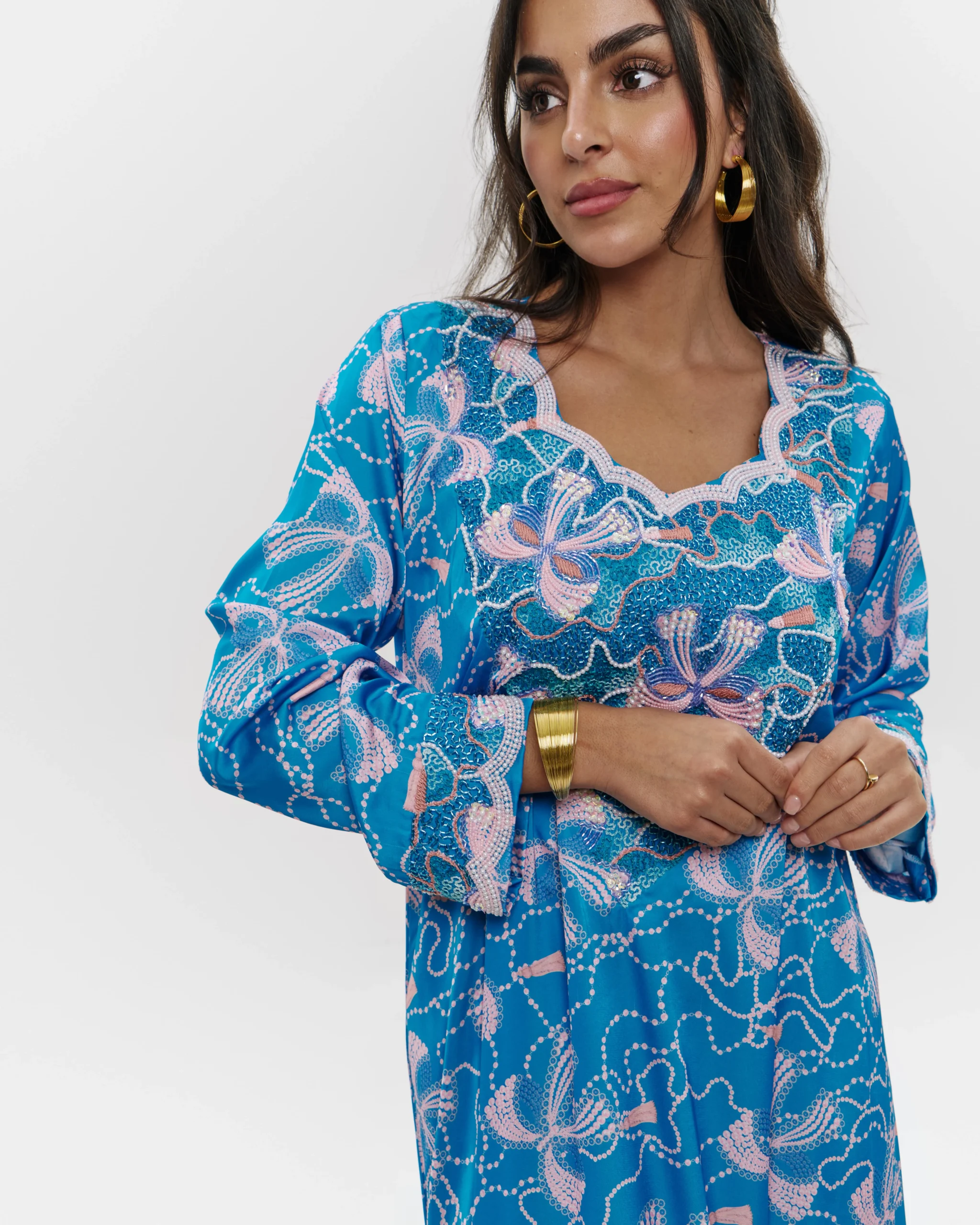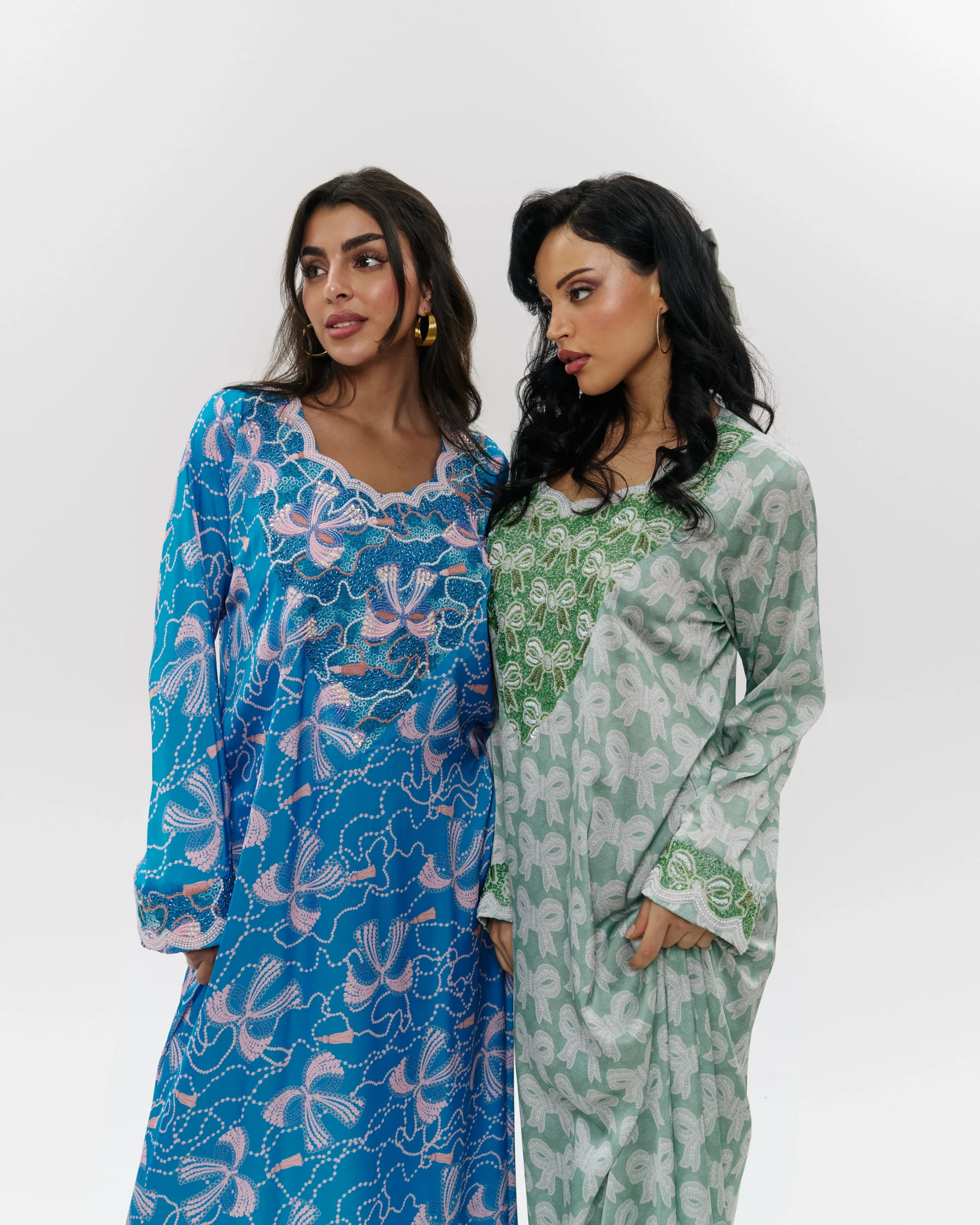 Blue loose-fitted jalabiyah with blue and pink embroidery. Baby pink ribbons pattern and baby pink neck and cuff piping.
