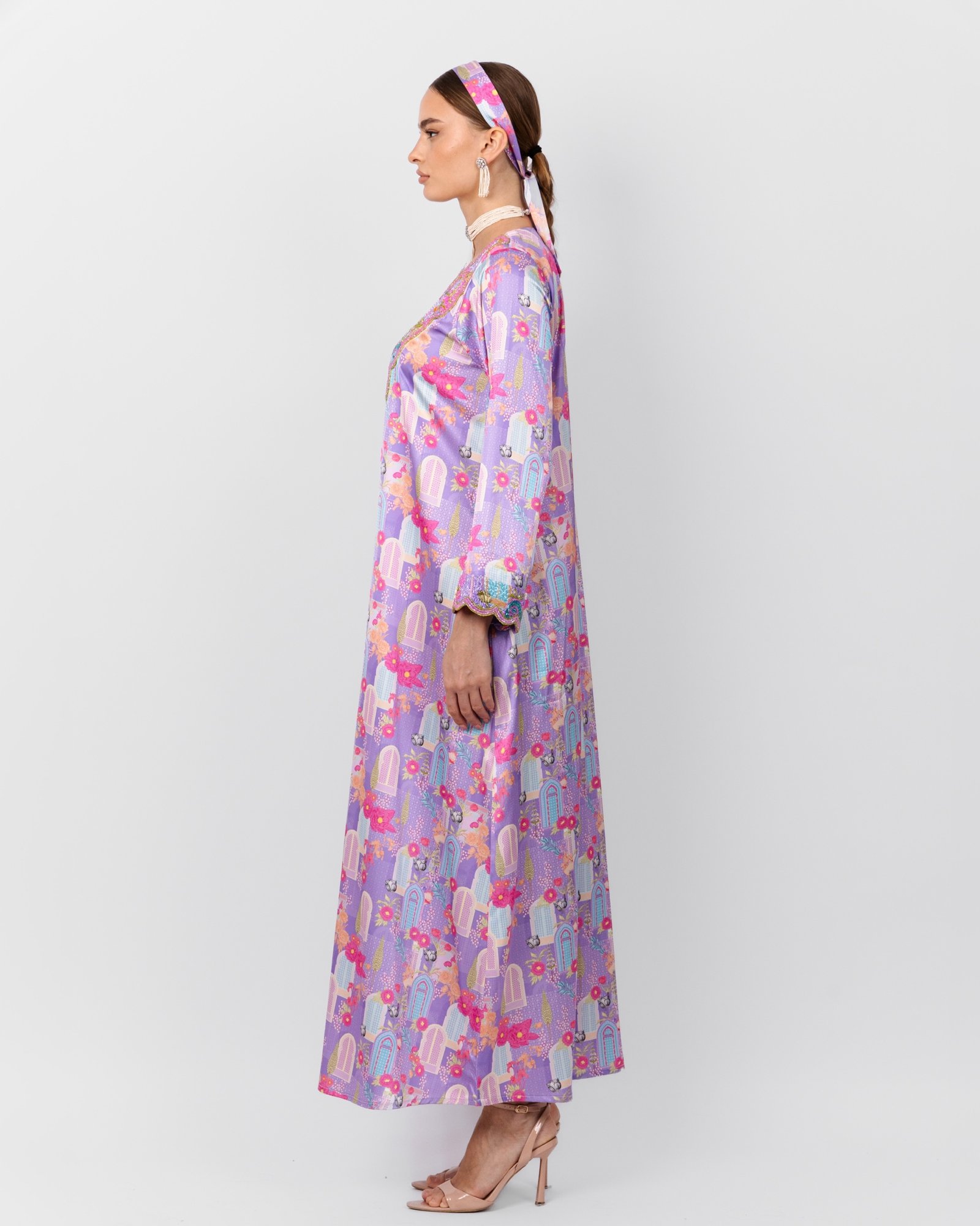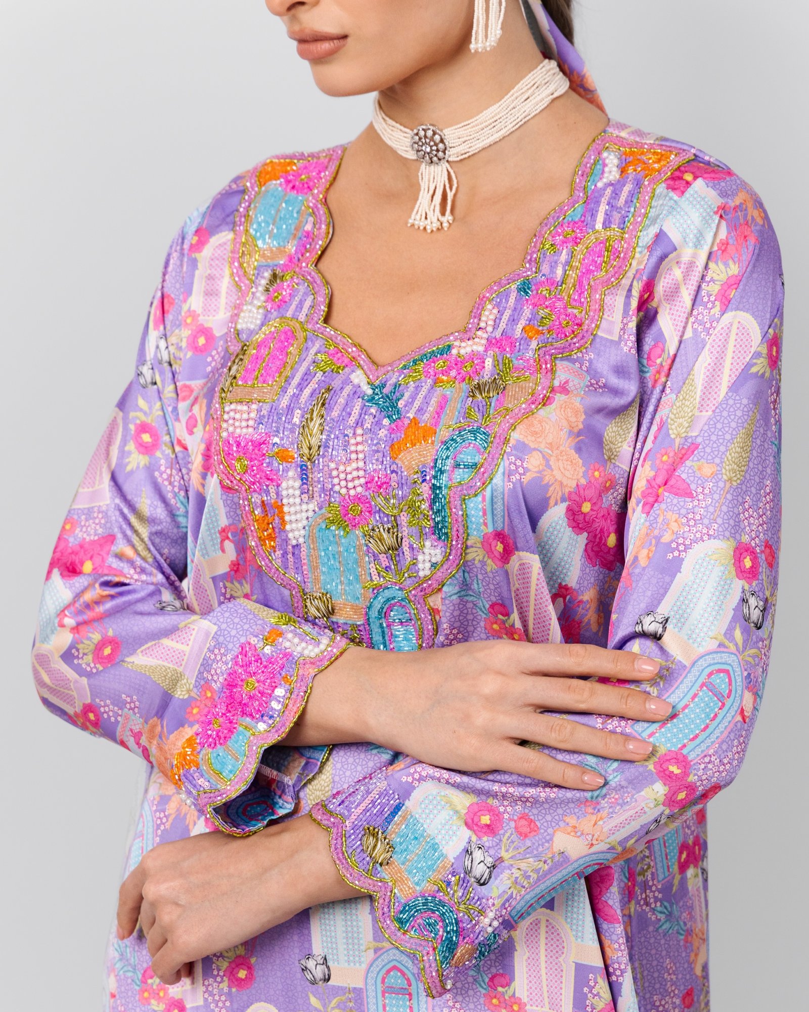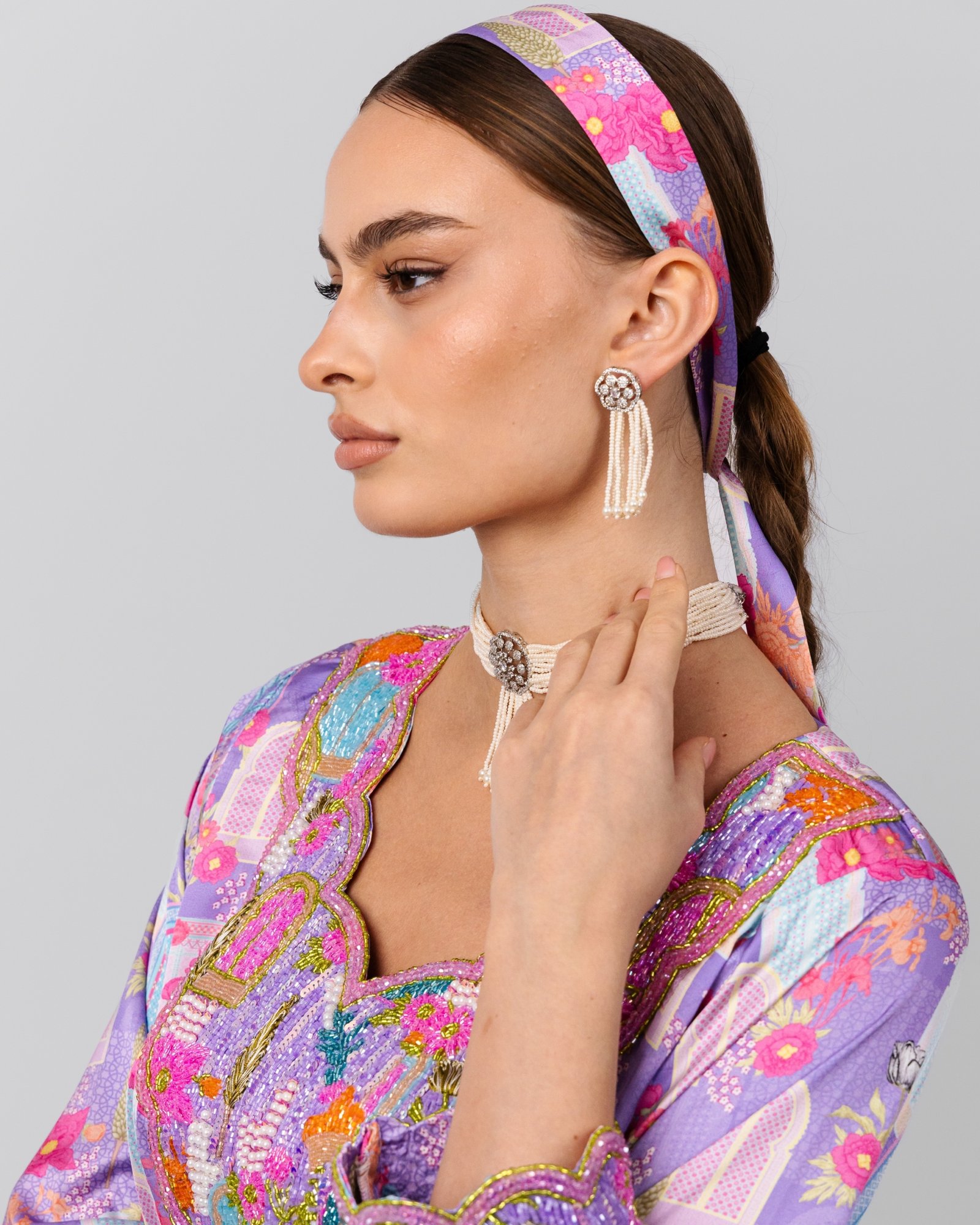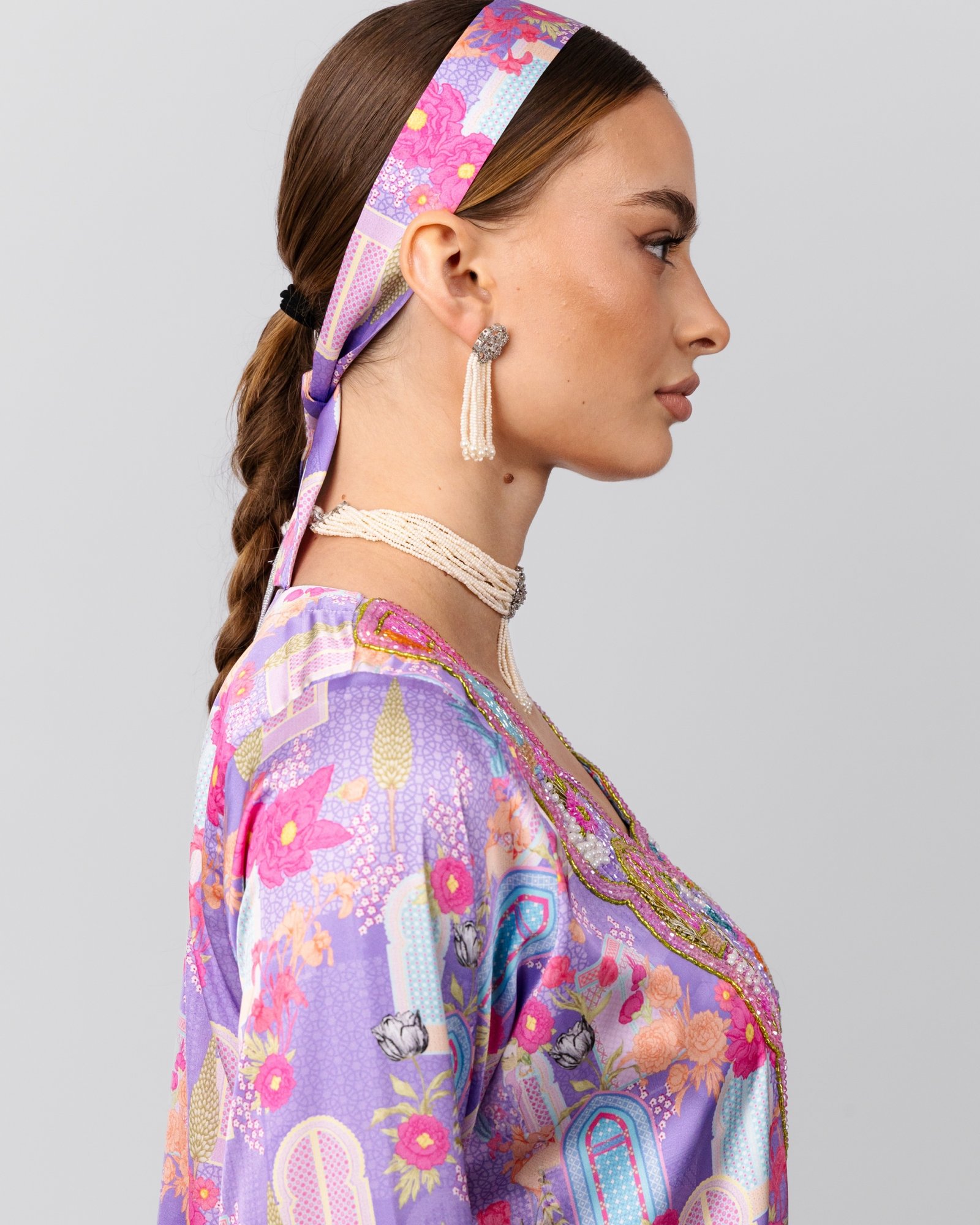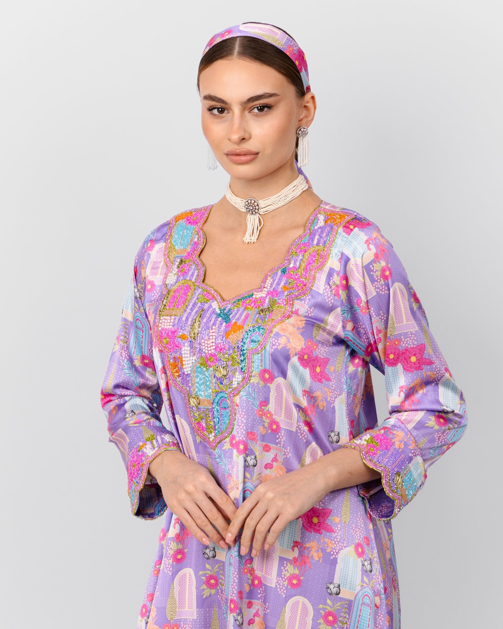 A romantic lavender floral dress with intricate beaded embroidery at the neckline and cuffs, styled with a beaded choker, drop earrings, and a matching headscarf for an elegant, bohemian-inspired look.