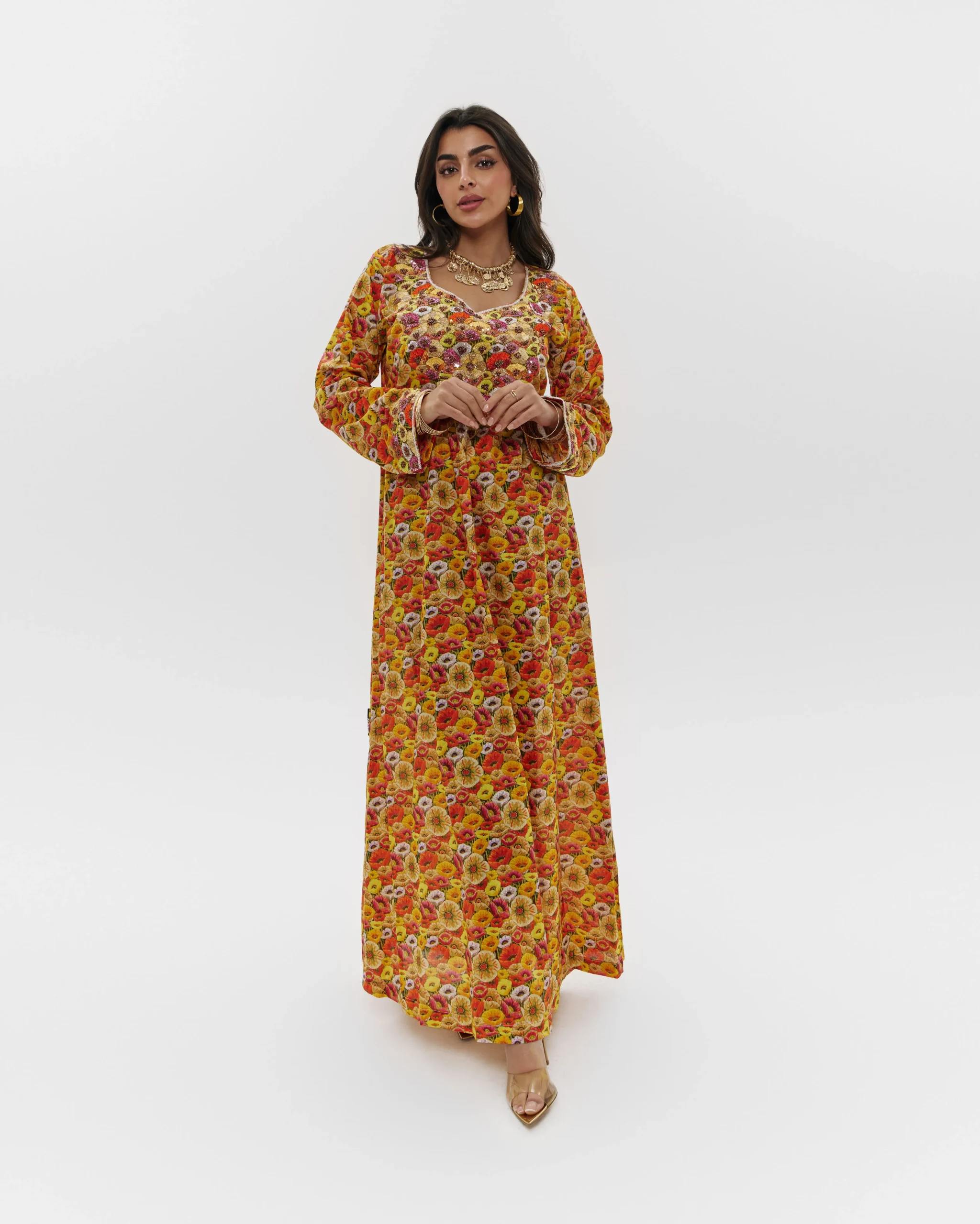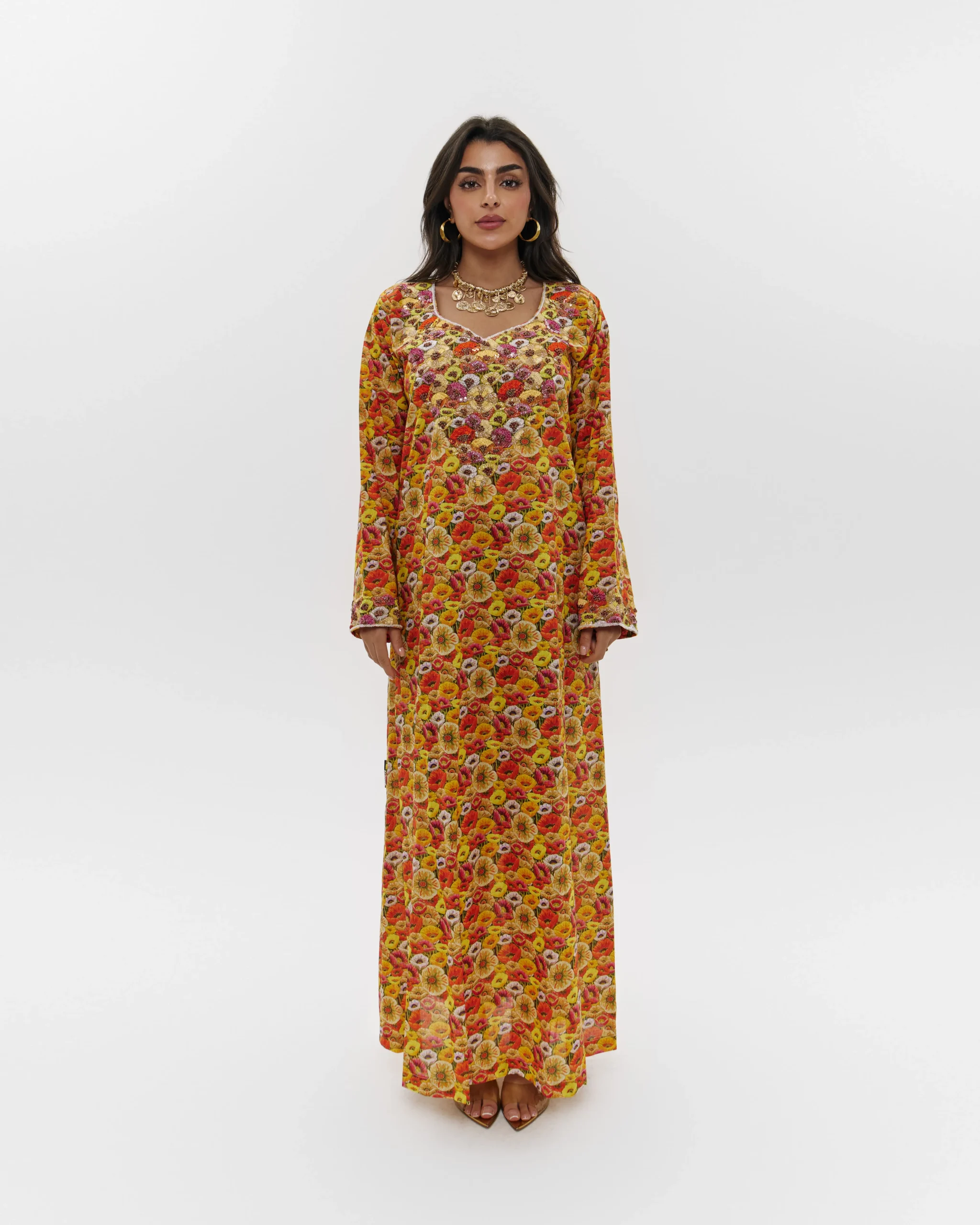 Yellow loose-fitted floral jalabiyah with embroidery and a v-neck. White piping on the neckline and cuffs.