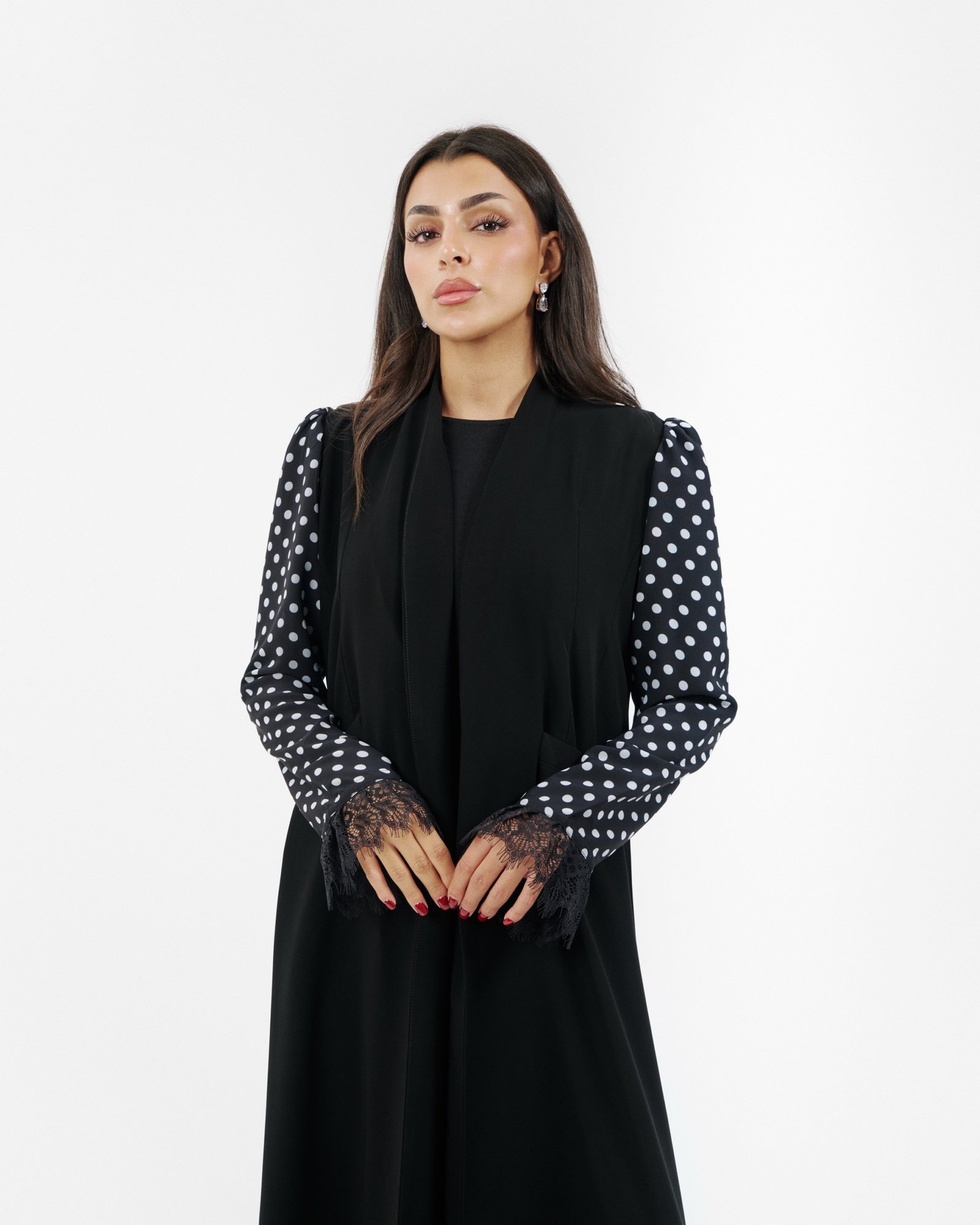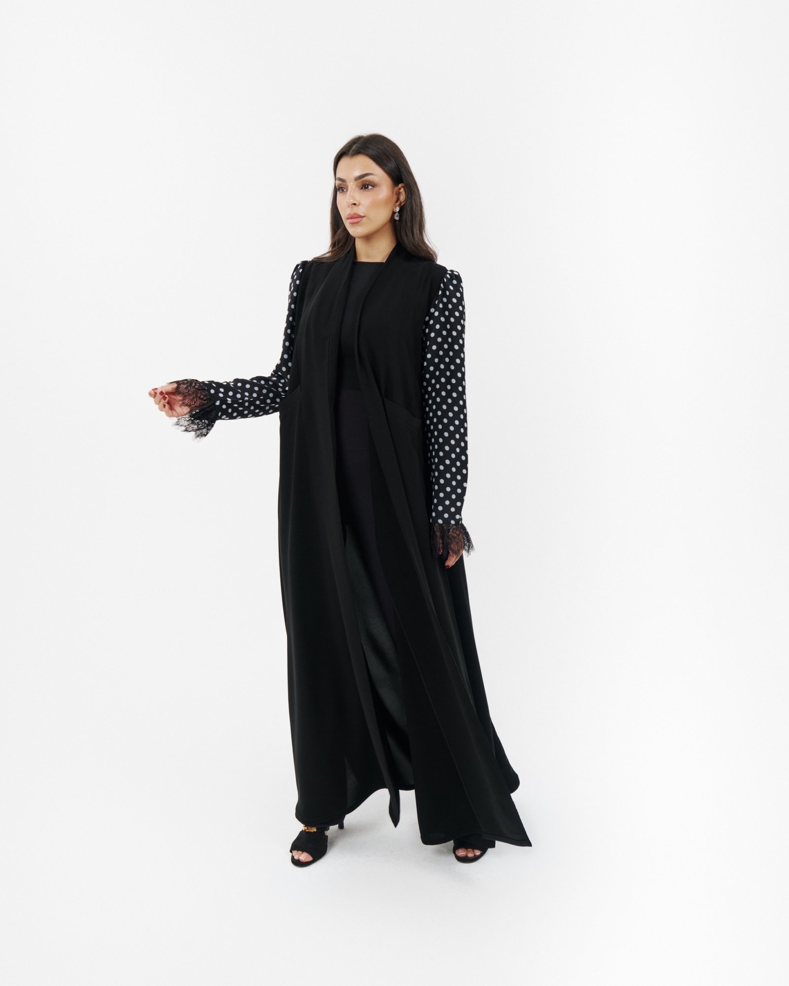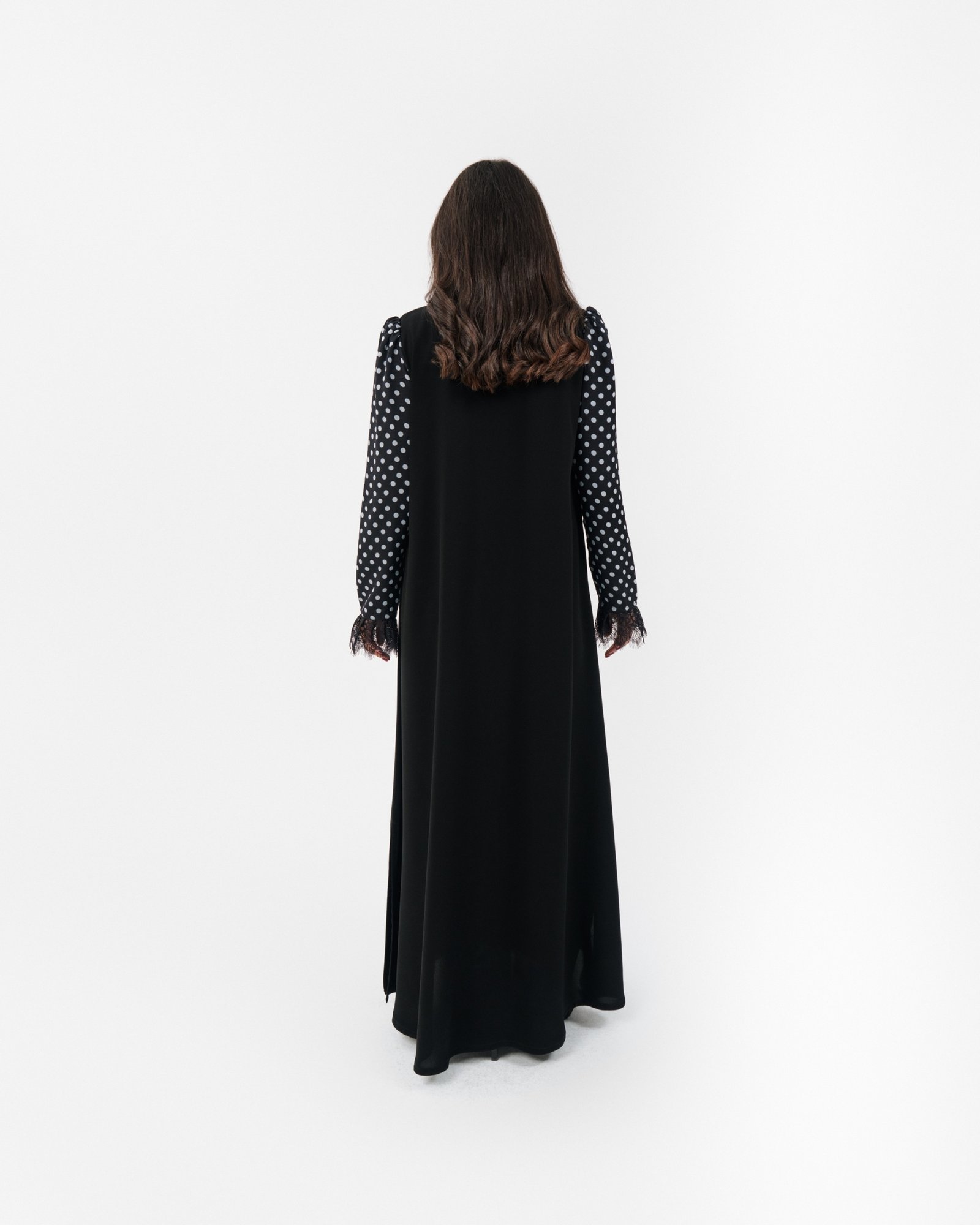 Elegant black abaya featuring handmade knot details.