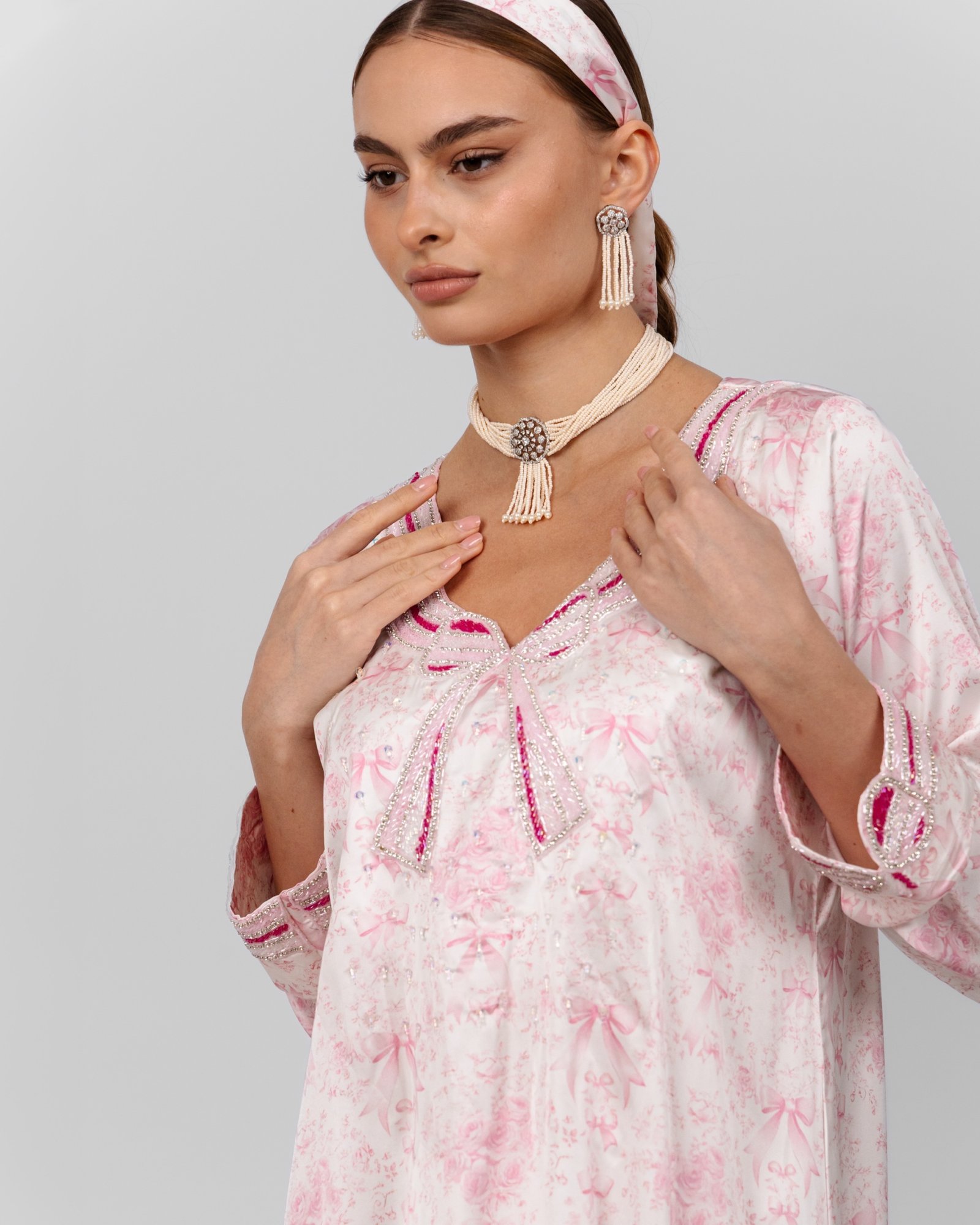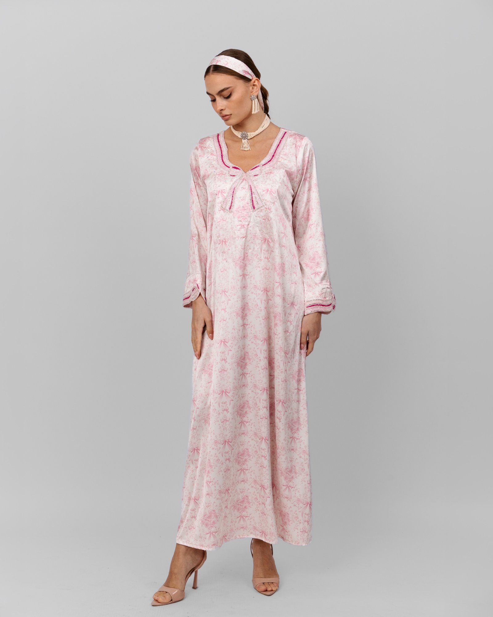 A soft pink floral maxi dress with delicate bow-inspired beaded detailing at the neckline and cuffs, styled with a pearl choker, drop earrings, matching headscarf, and nude heels for a sweet, feminine look.