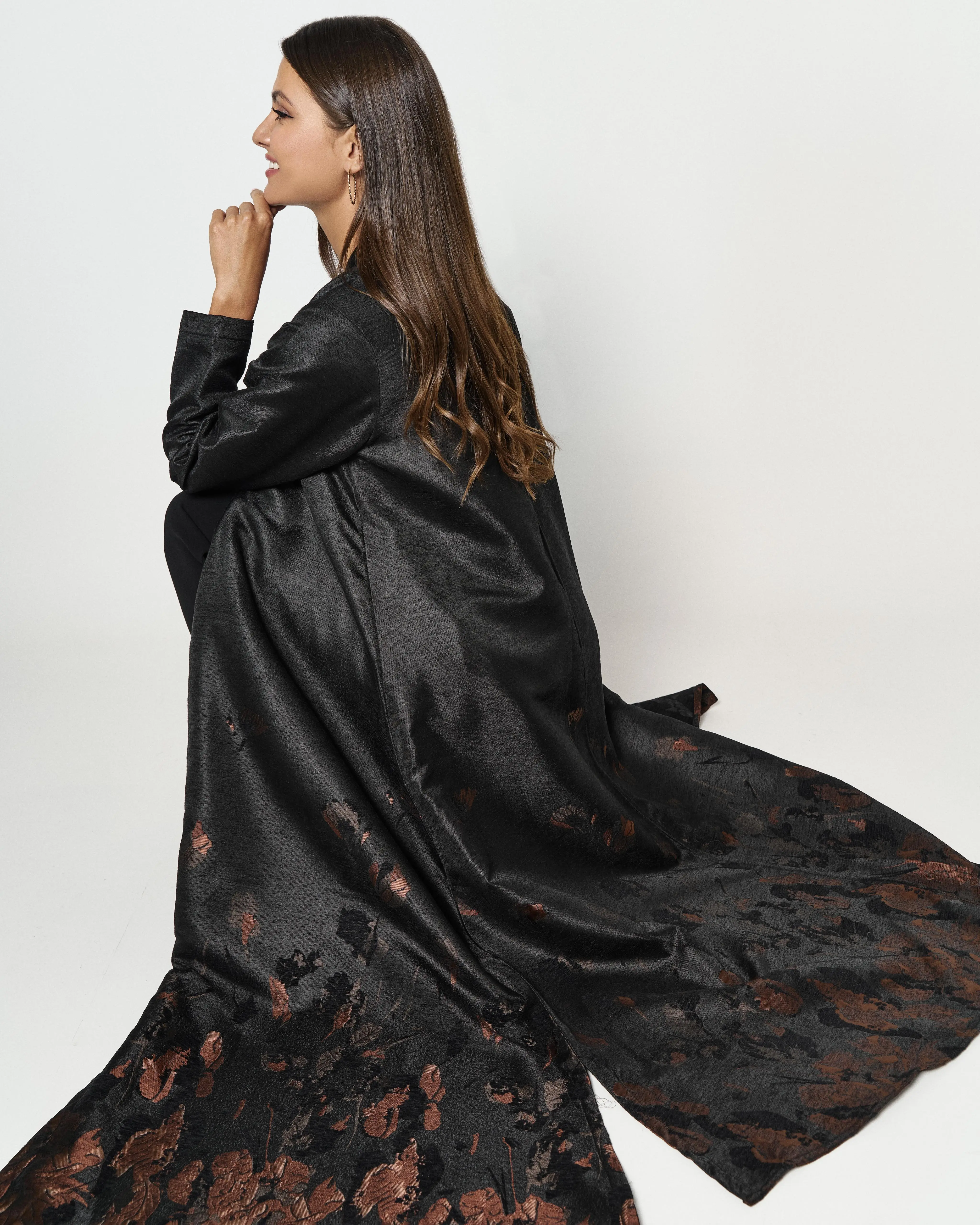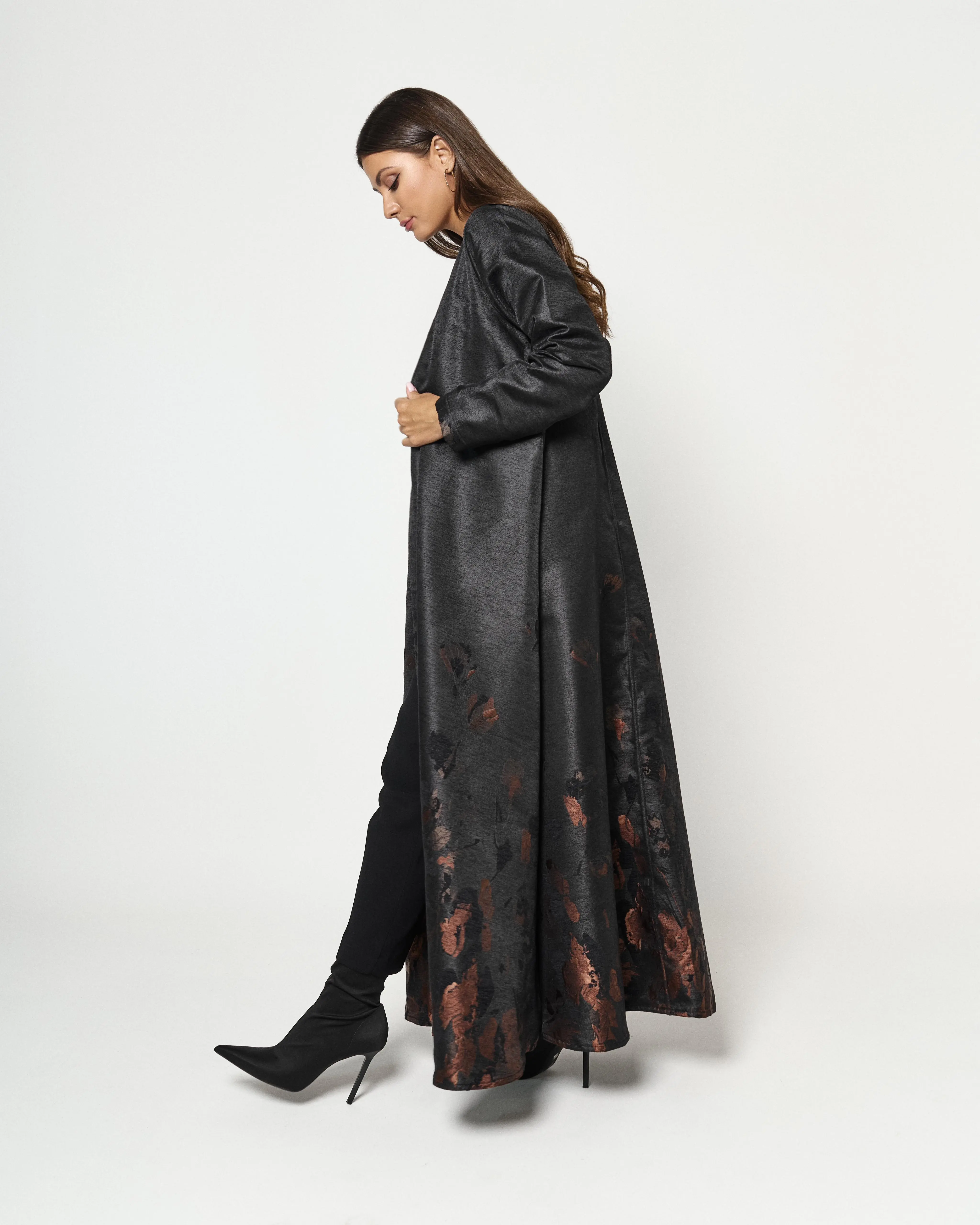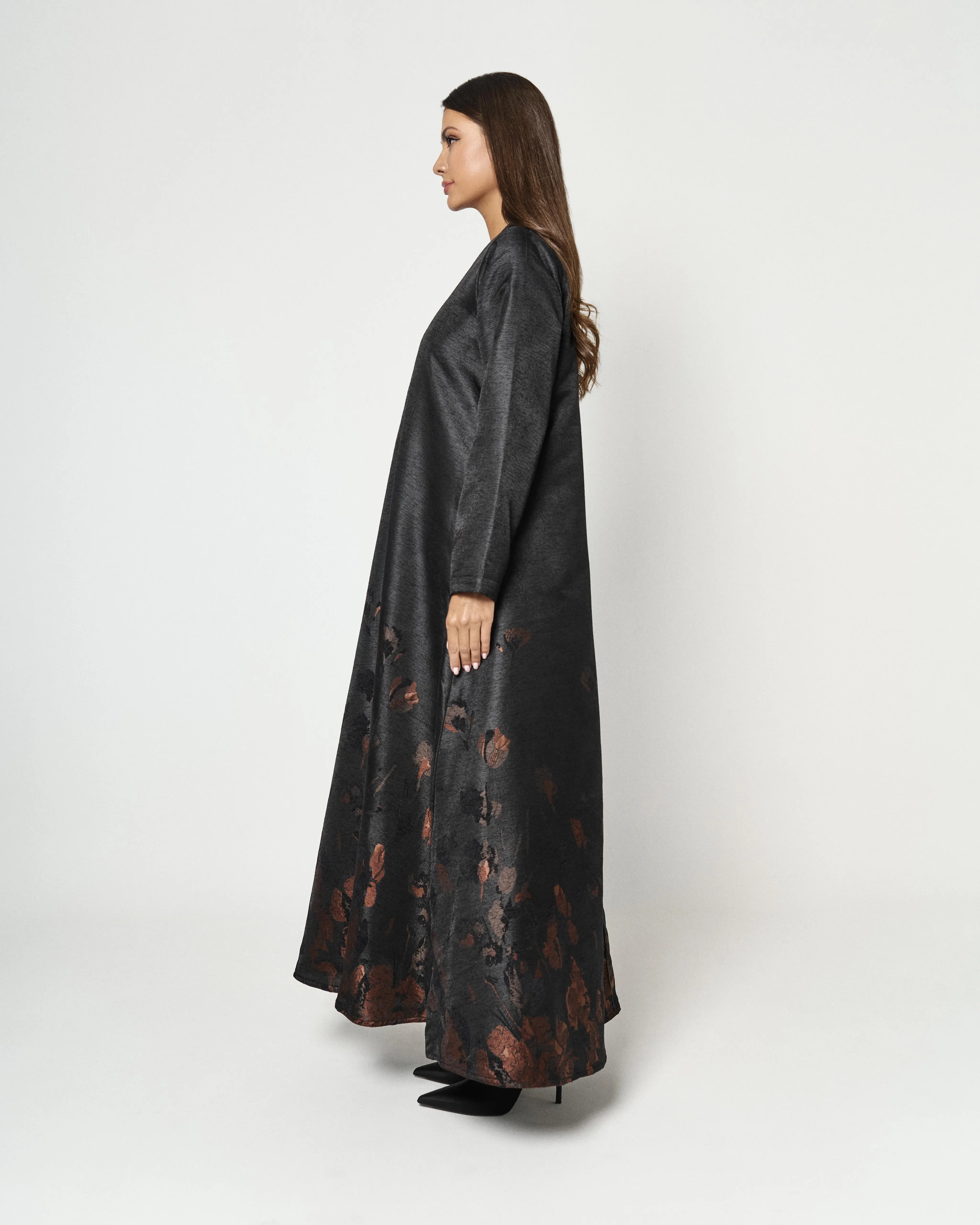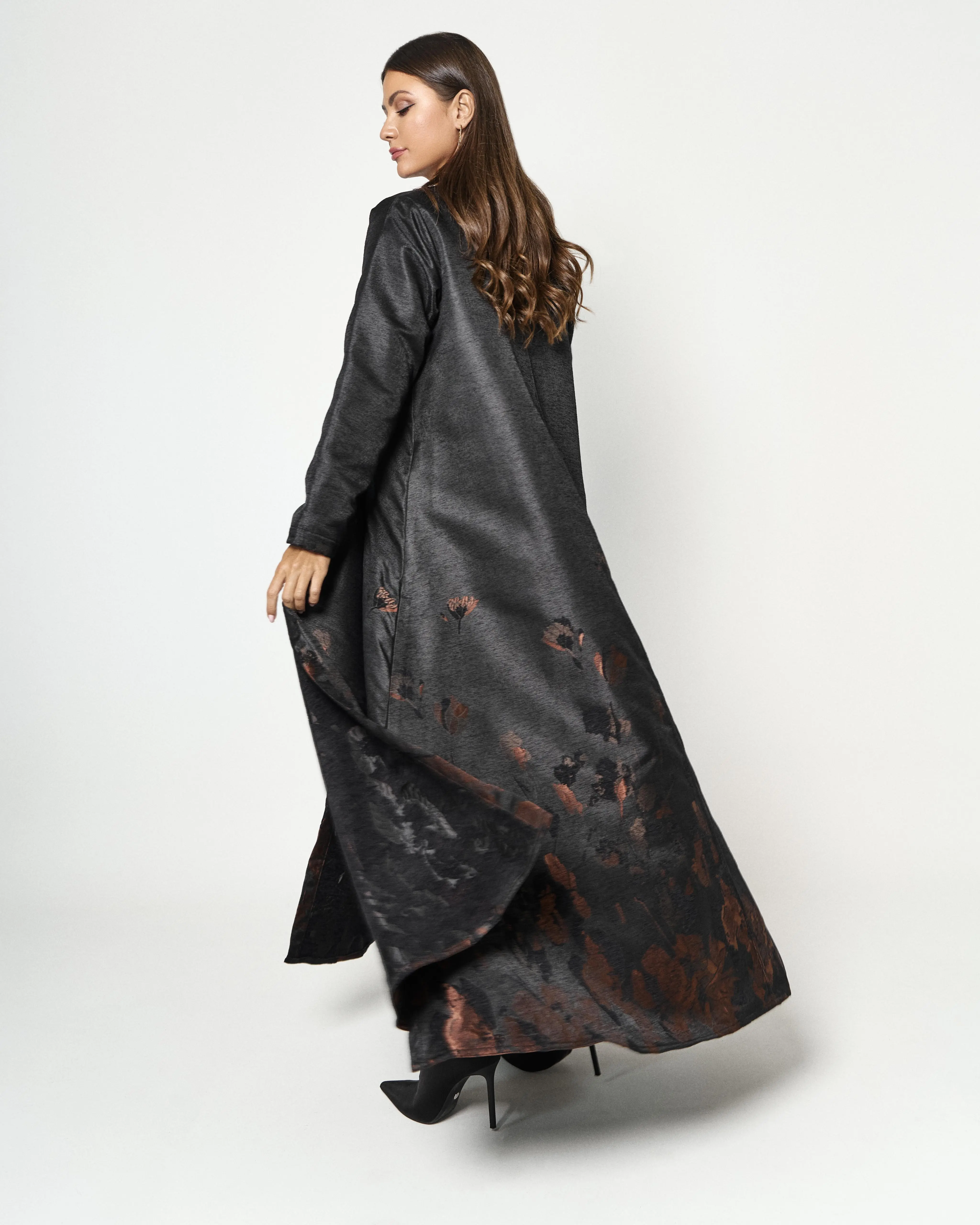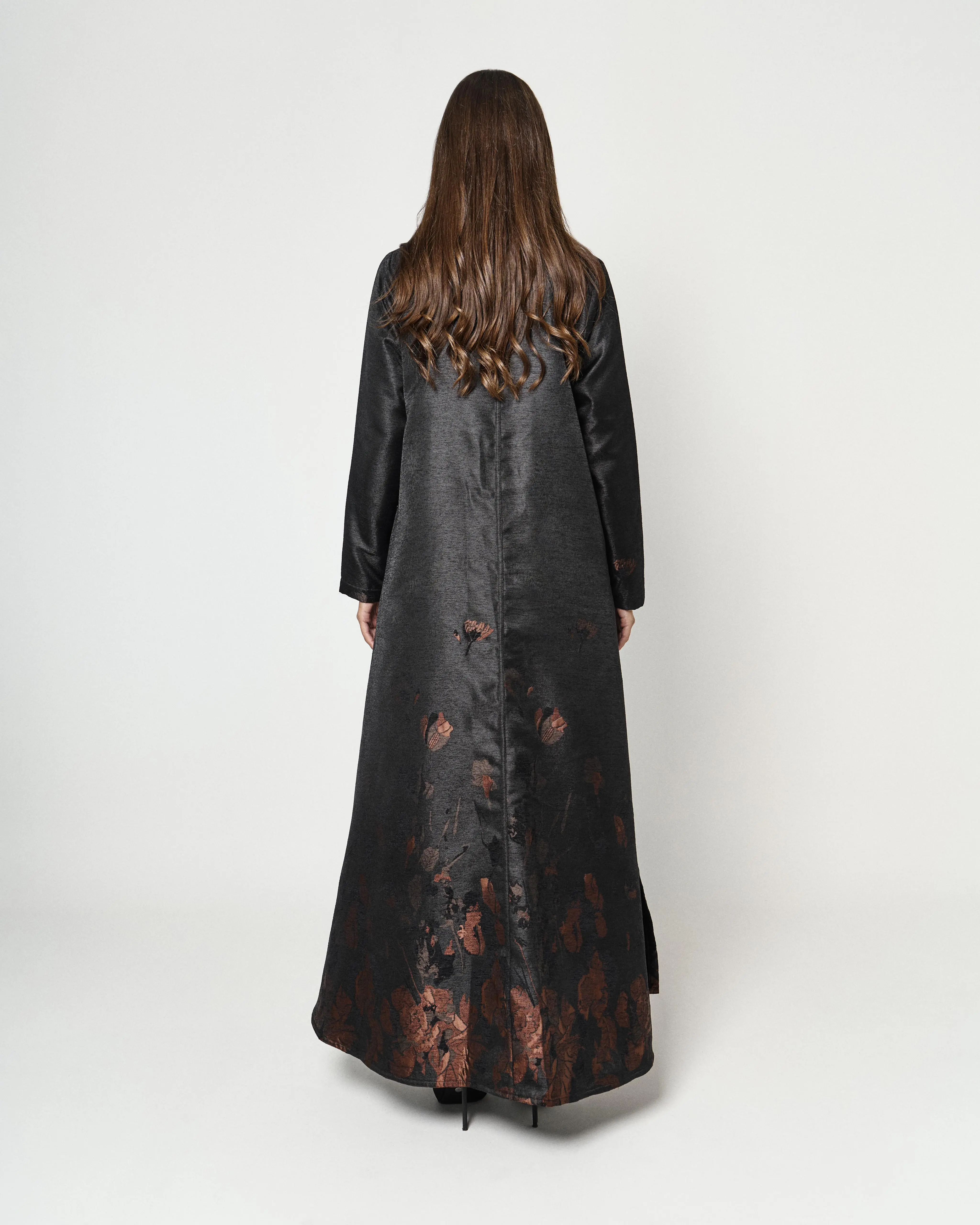 Details: Black shiny abaya with two side slits. The floral print is limited, therefore, making this piece exclusive. The beautiful floral print enhances the femininity of the abaya making it exceptionally elegant and classy. Additionally, the fabric of the abaya keeps you cozy making it more suitable for winter.