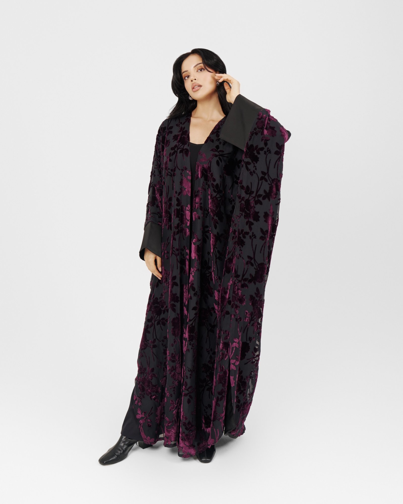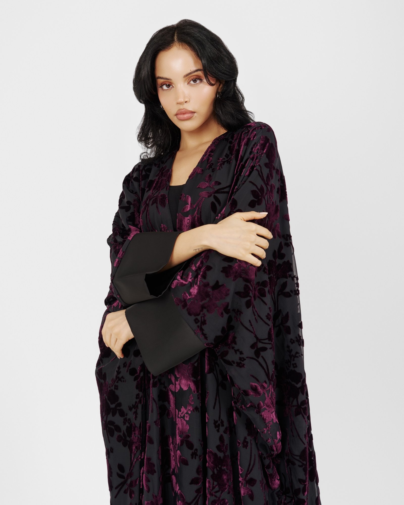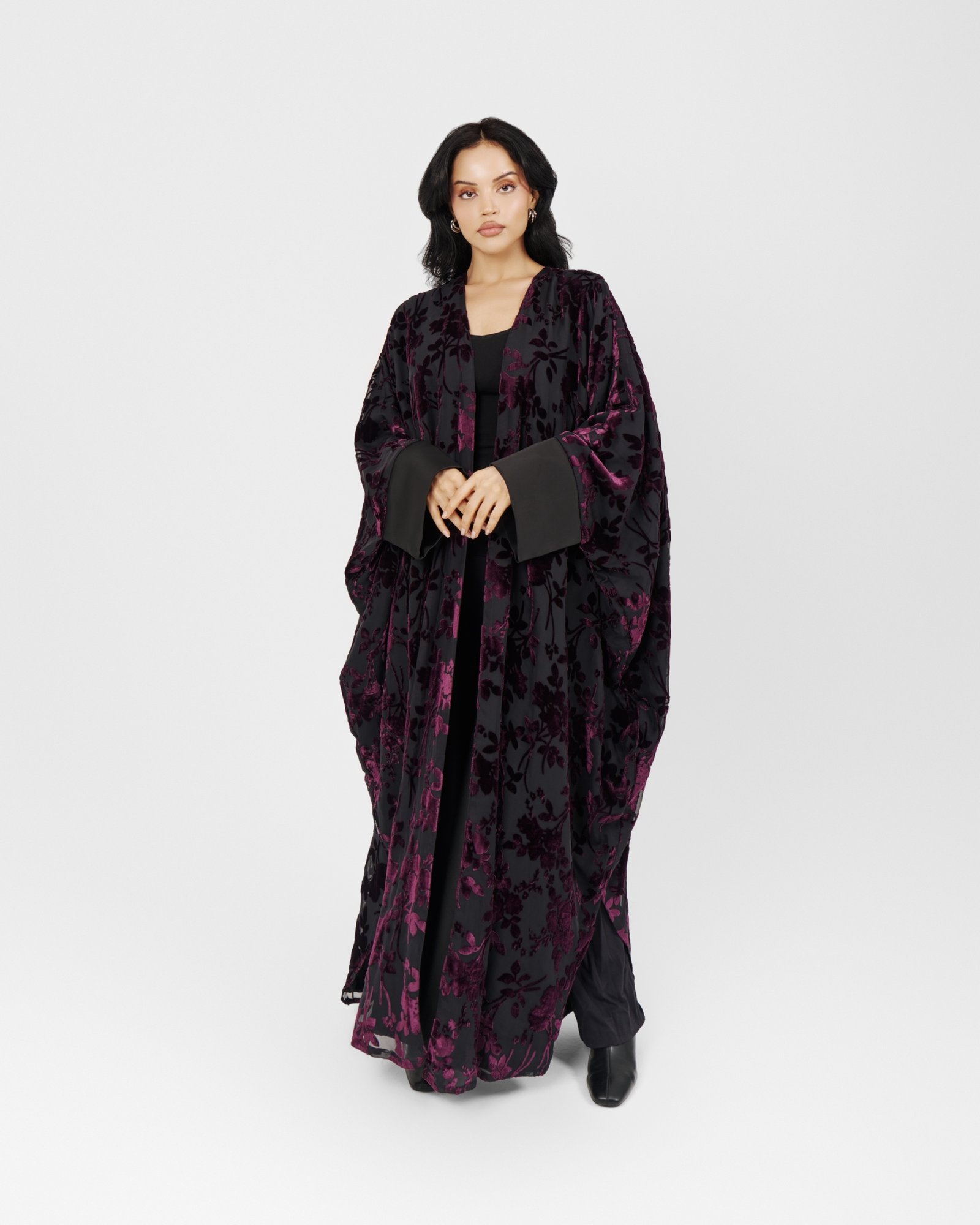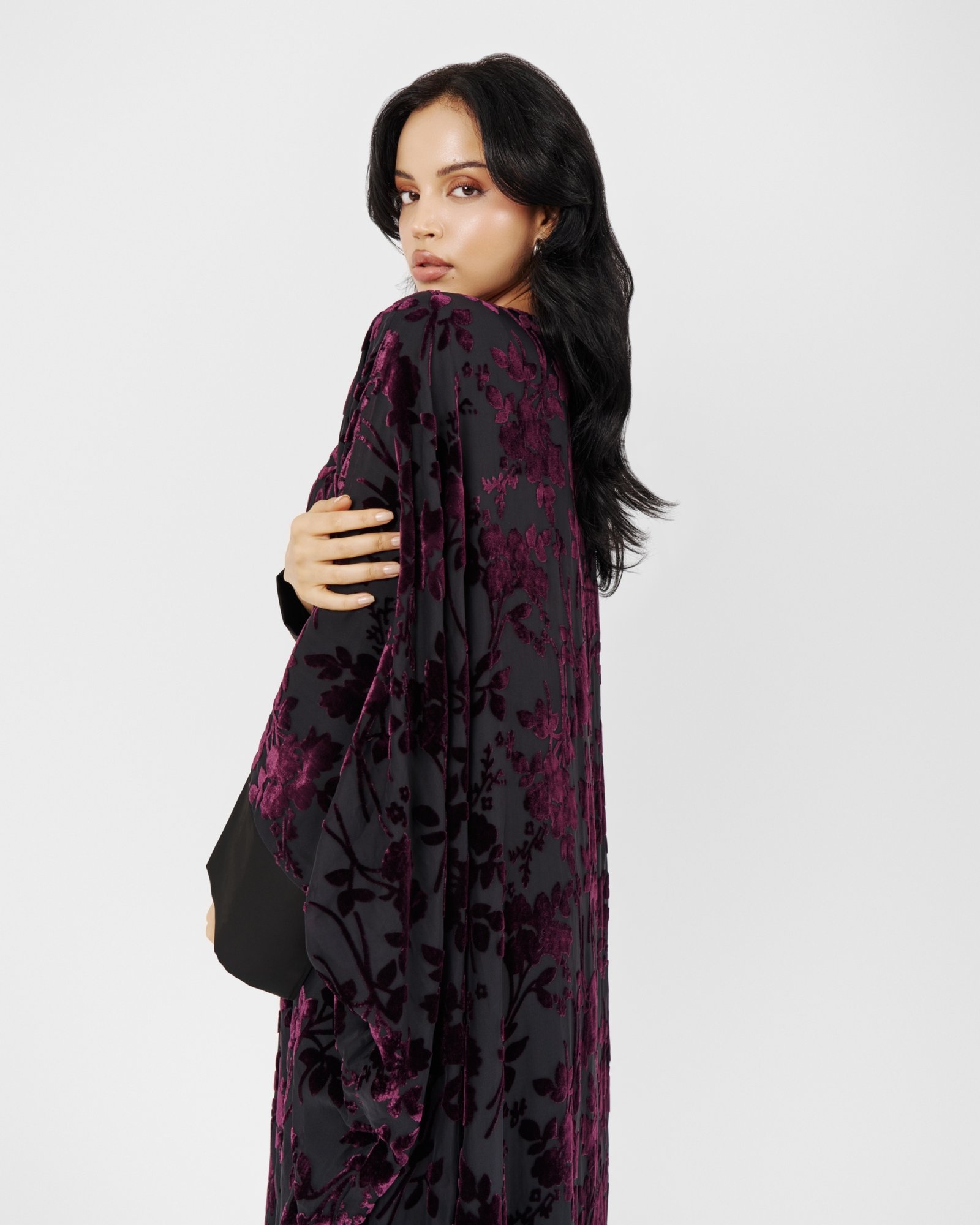 A flowing black abaya adorned with rich plum velvet florals, featuring wide structured cuffs and a draped, airy silhouette. Bold yet elegant, it adds statement luxury to any refined wardrobe.