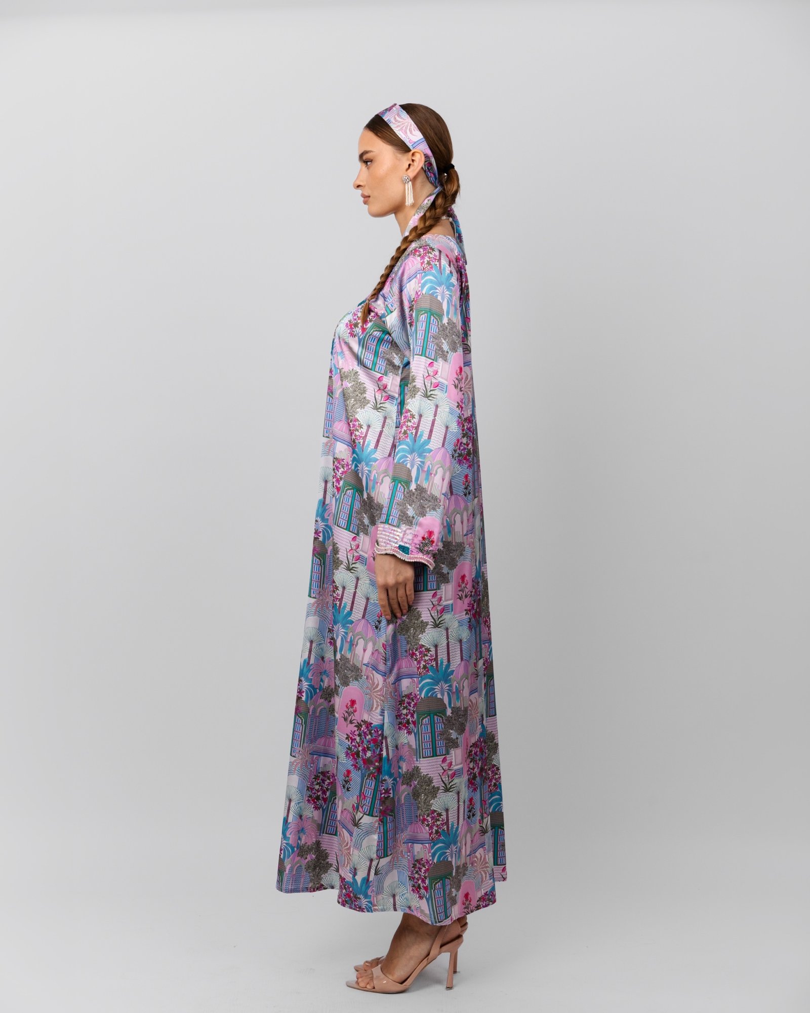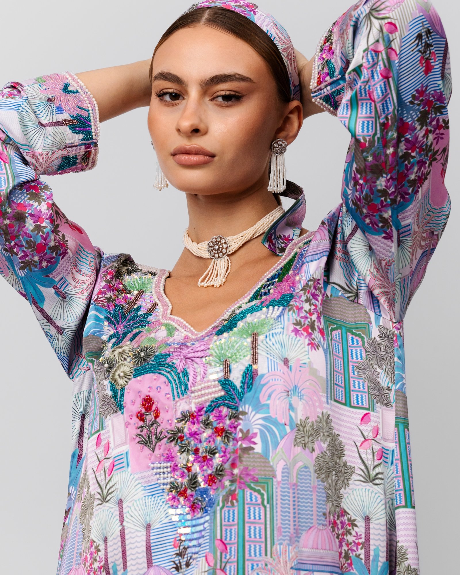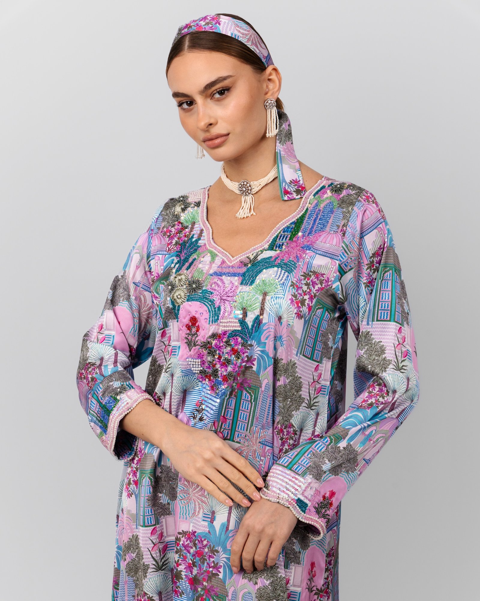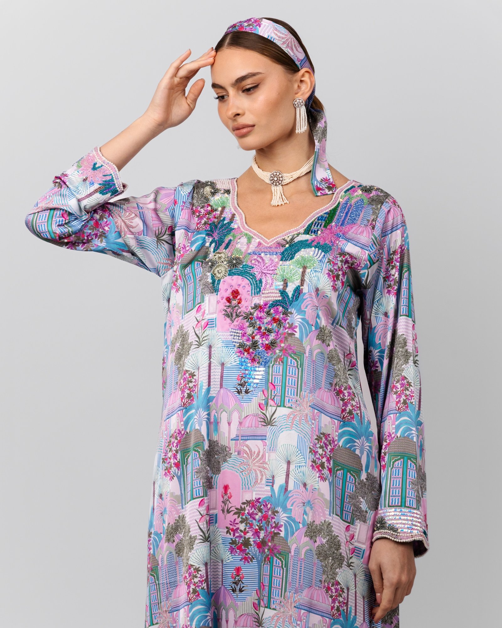 A vibrant pink and teal printed maxi dress with intricate floral beadwork at the neckline, styled with a pearl choker, statement drop earrings, matching headscarf, and nude heels for a bold yet elegant look.