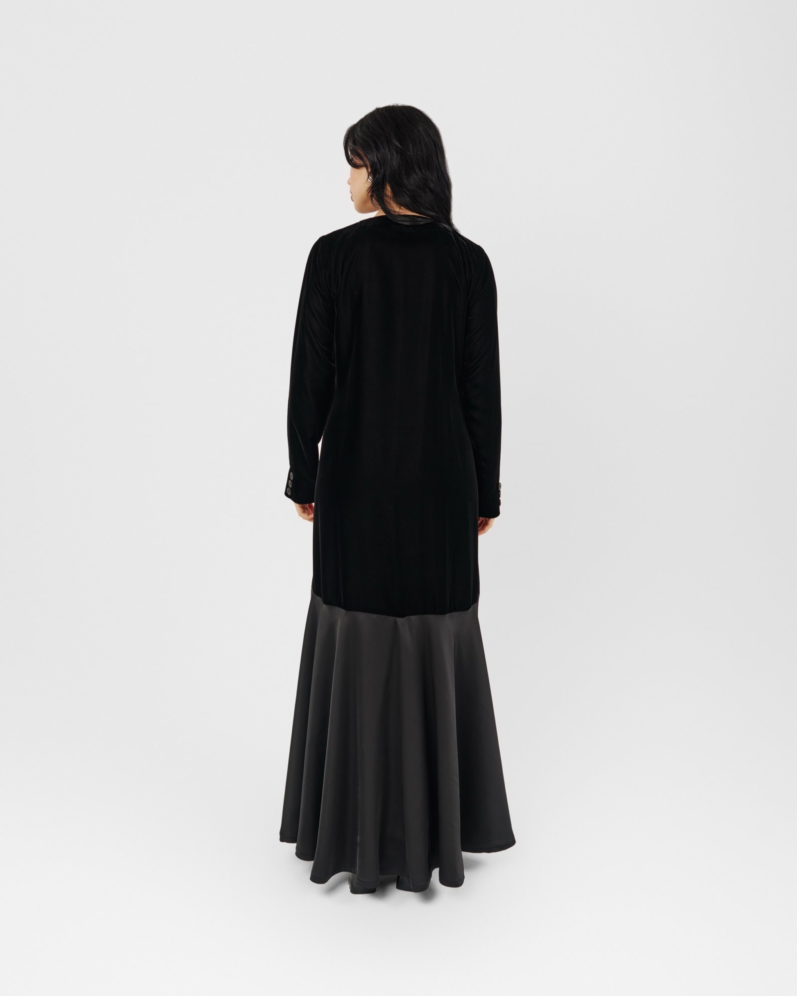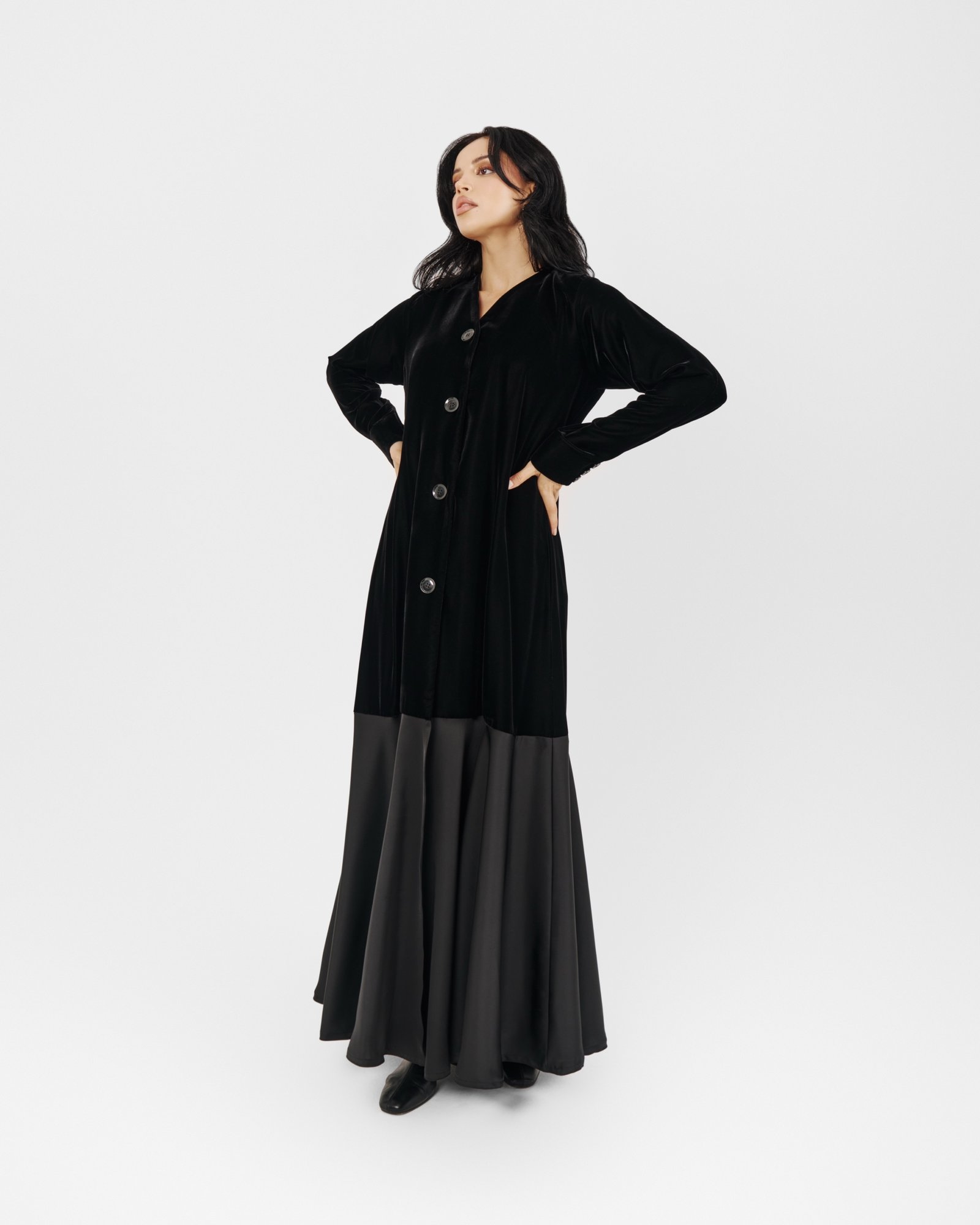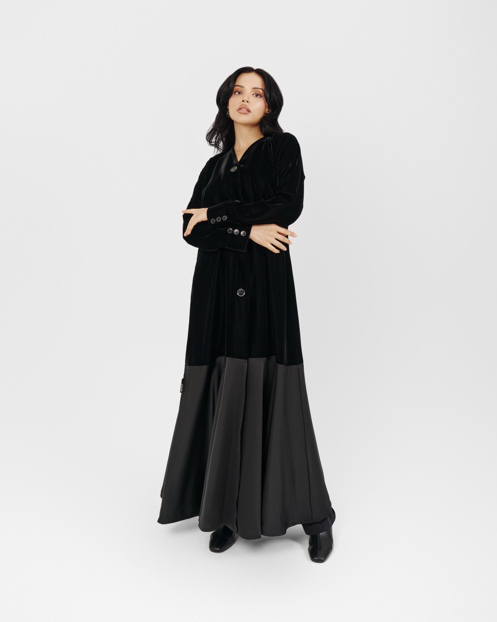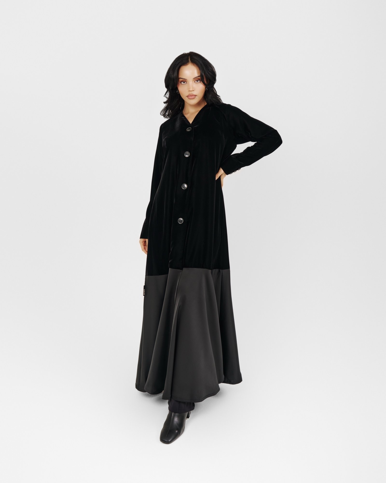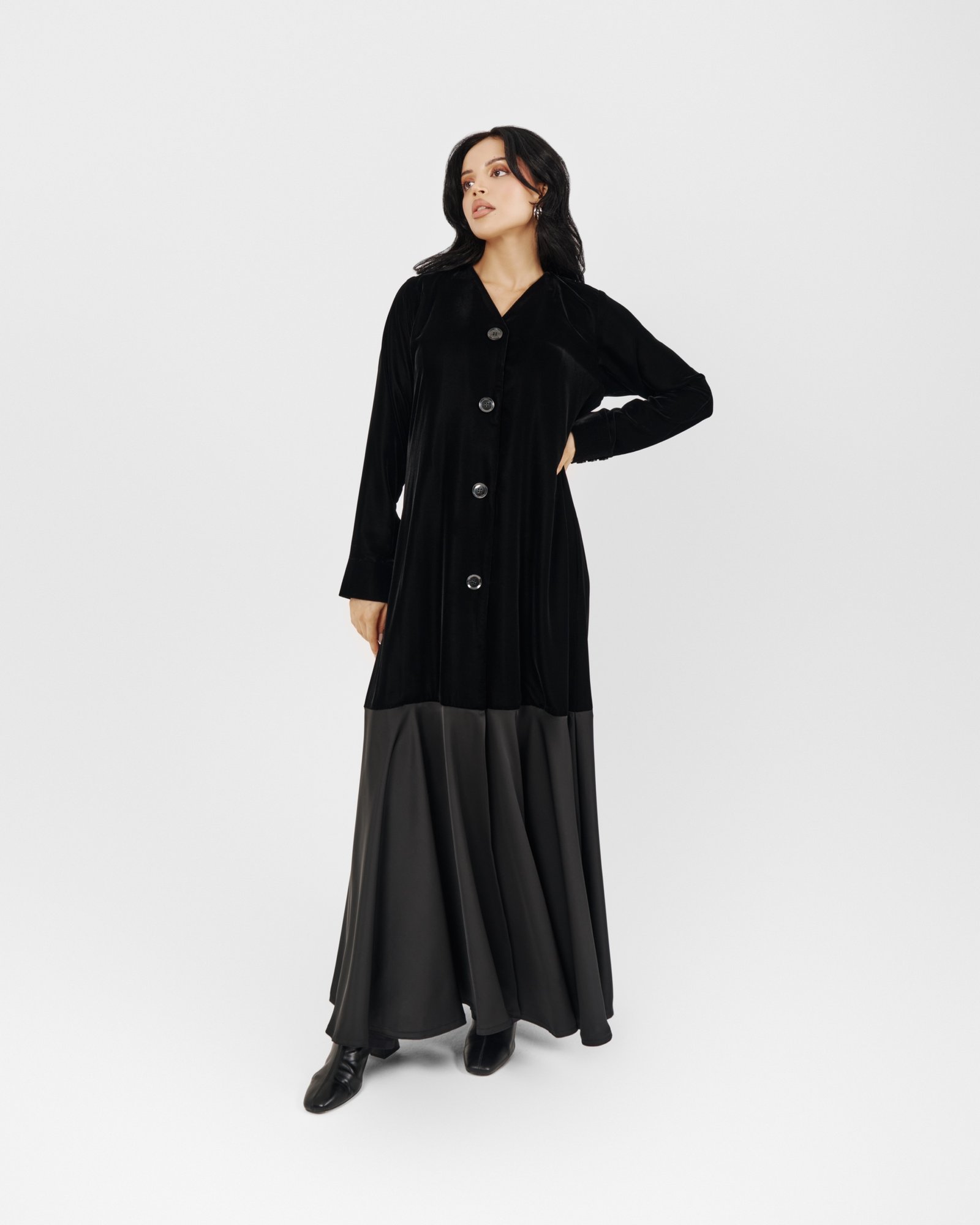 A modern black abaya featuring a soft velvet upper and a flowing satin lower panel, finished with oversized statement buttons. Sleek, contemporary, and effortlessly refined.