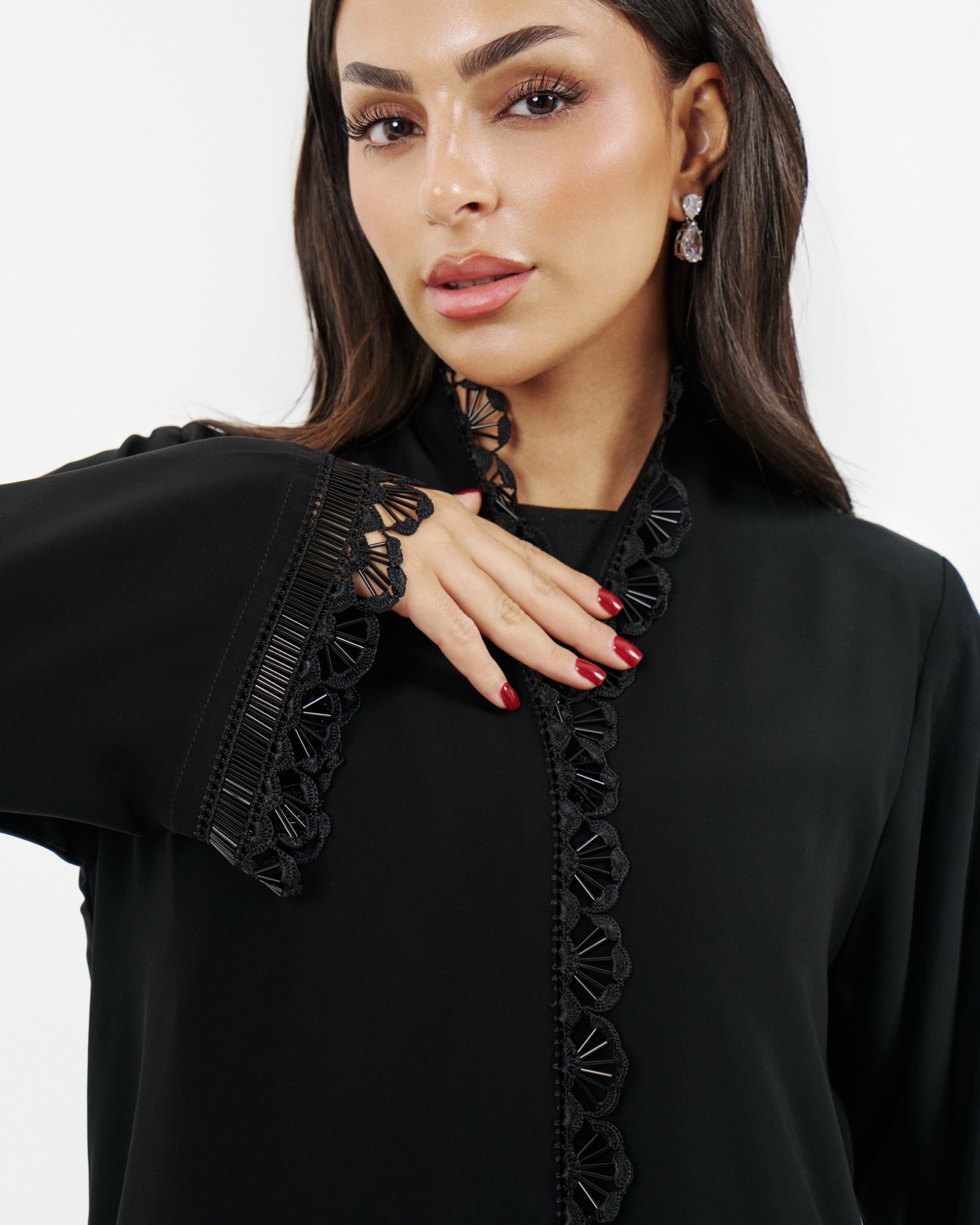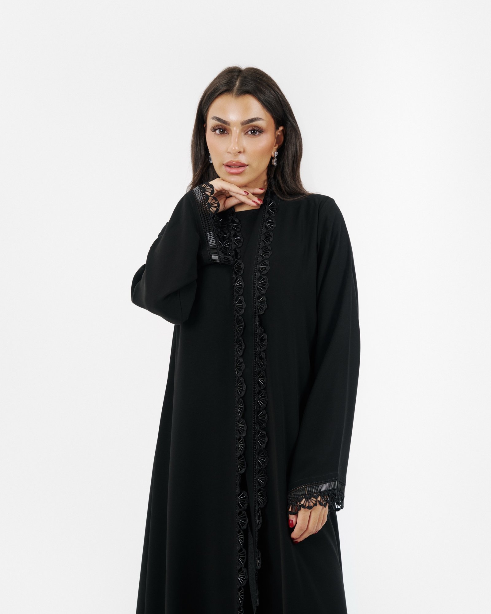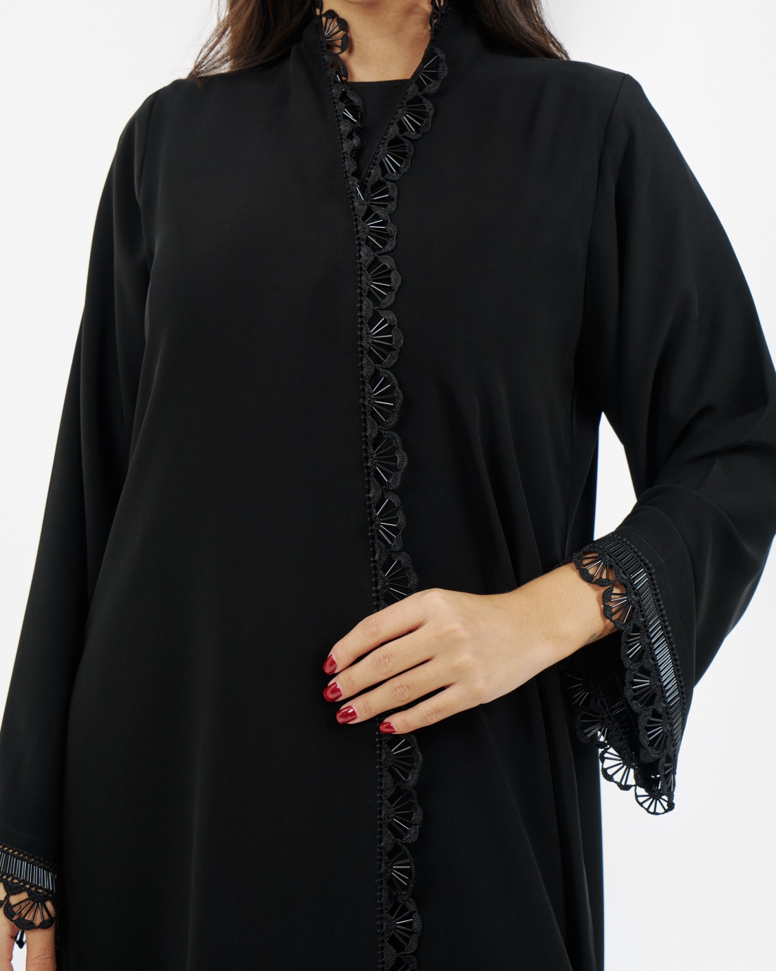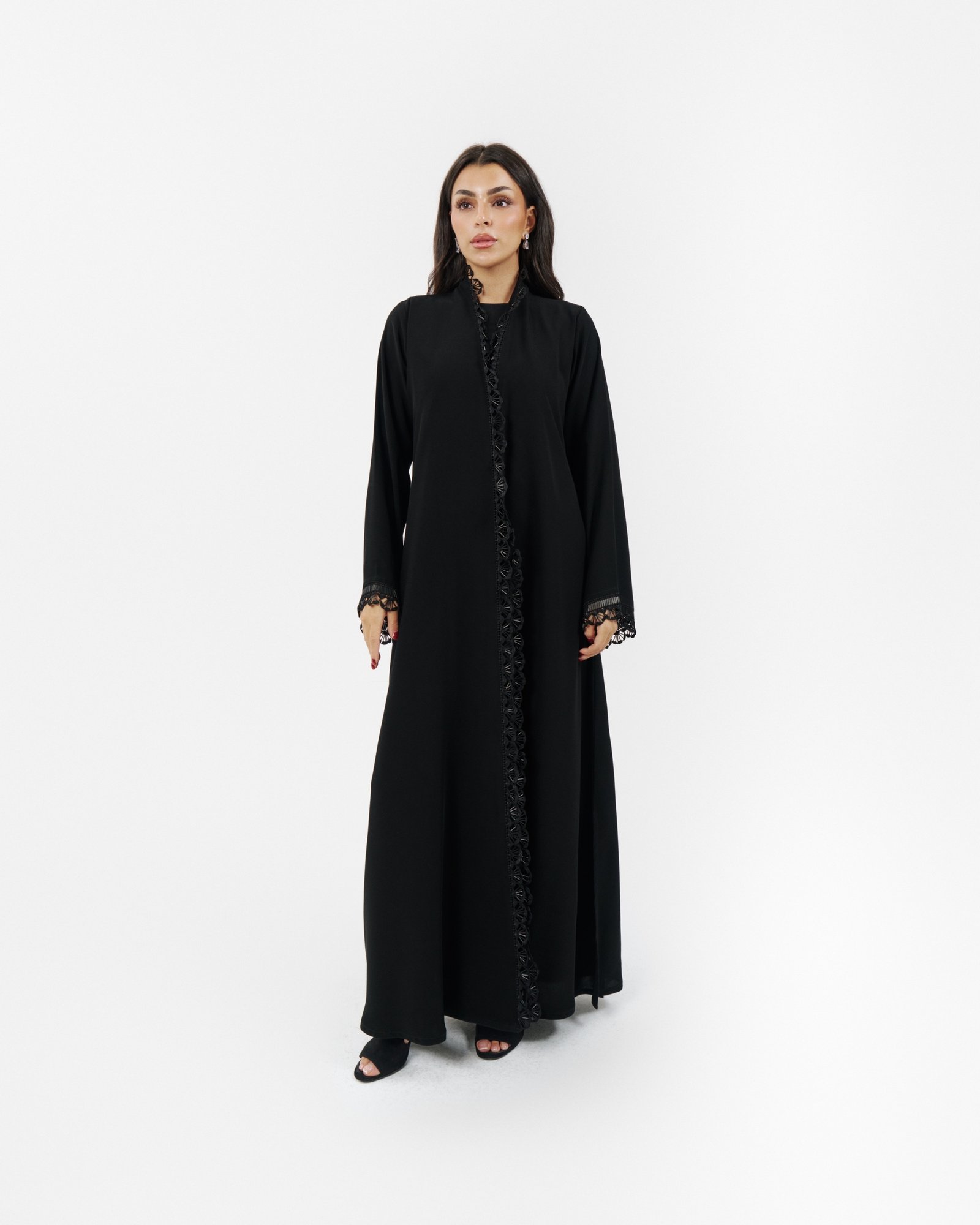 Black abaya with delicate handmade embroidery and elegant sleeve details.