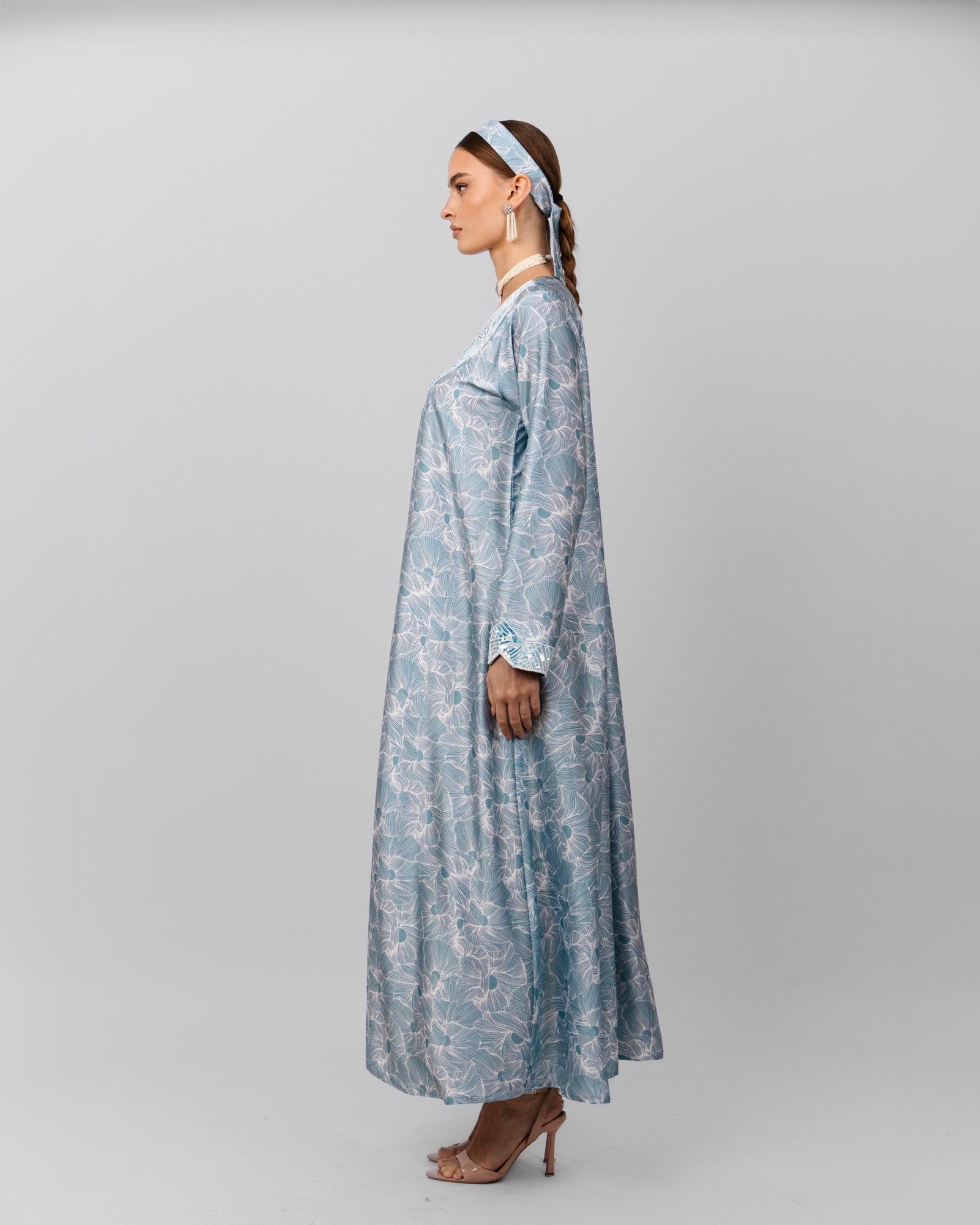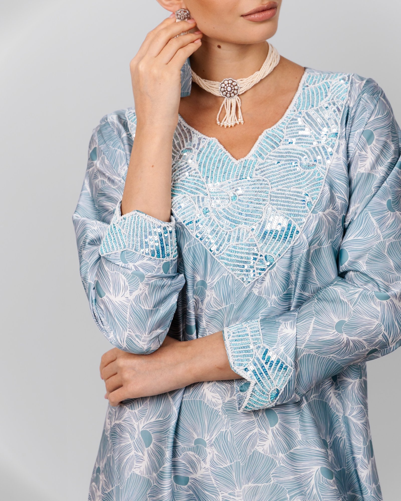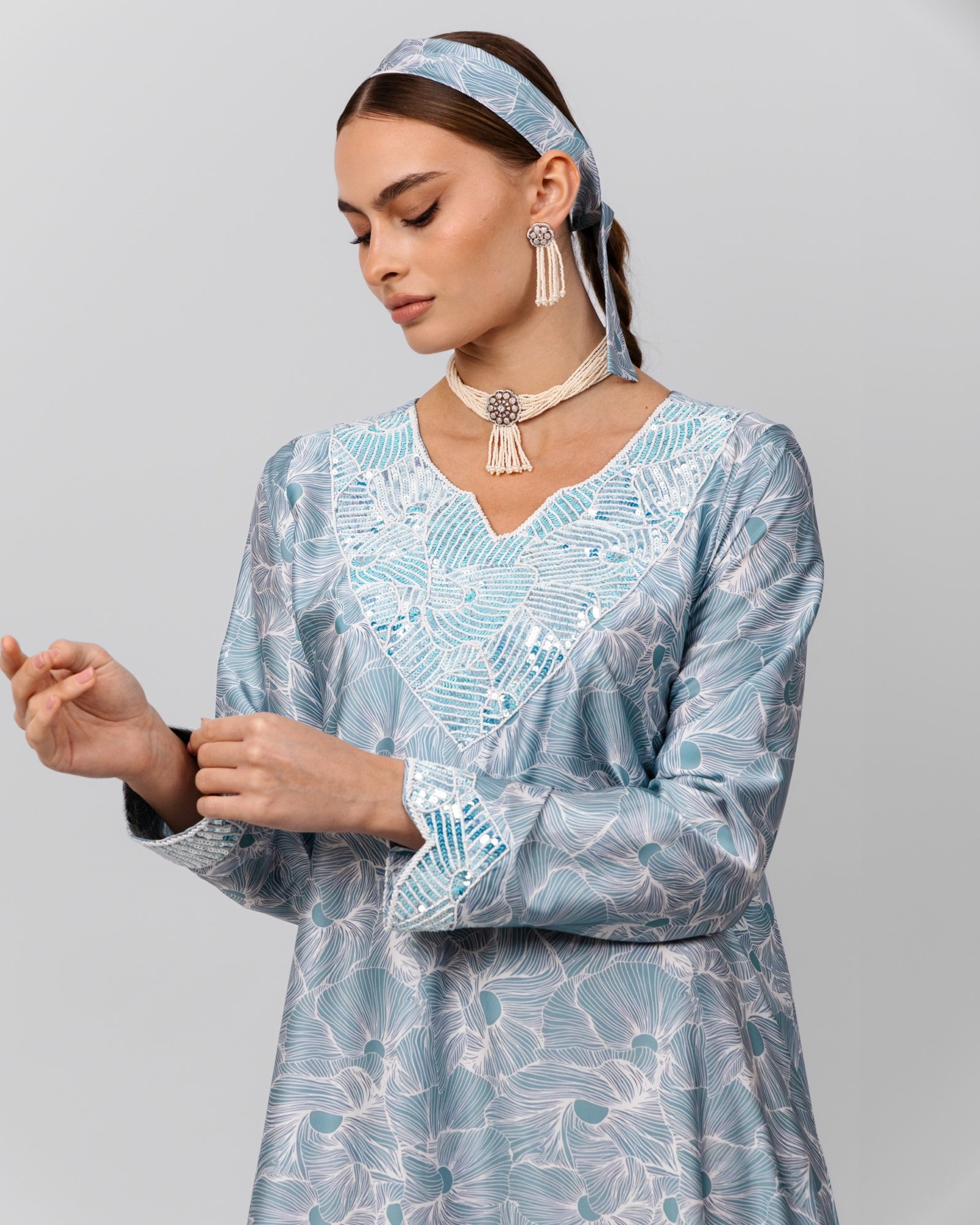 A soft blue floral maxi dress with delicate sequin embroidery at the neckline and cuffs, styled with a pearl choker, drop earrings, matching headscarf, and nude heels for a graceful, understated look.
