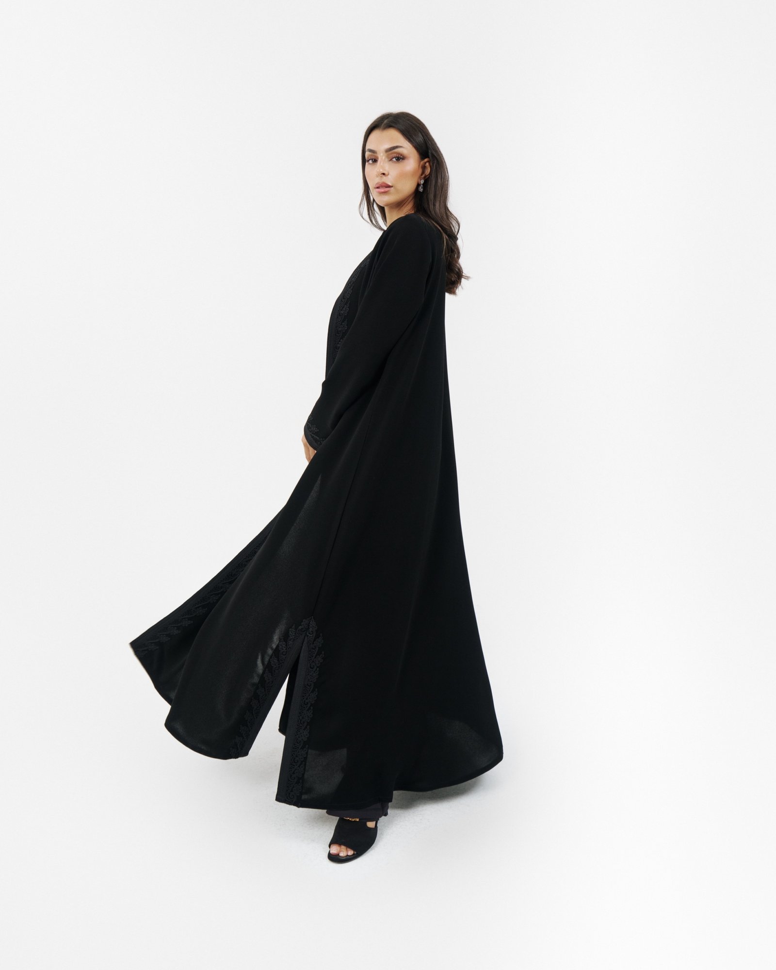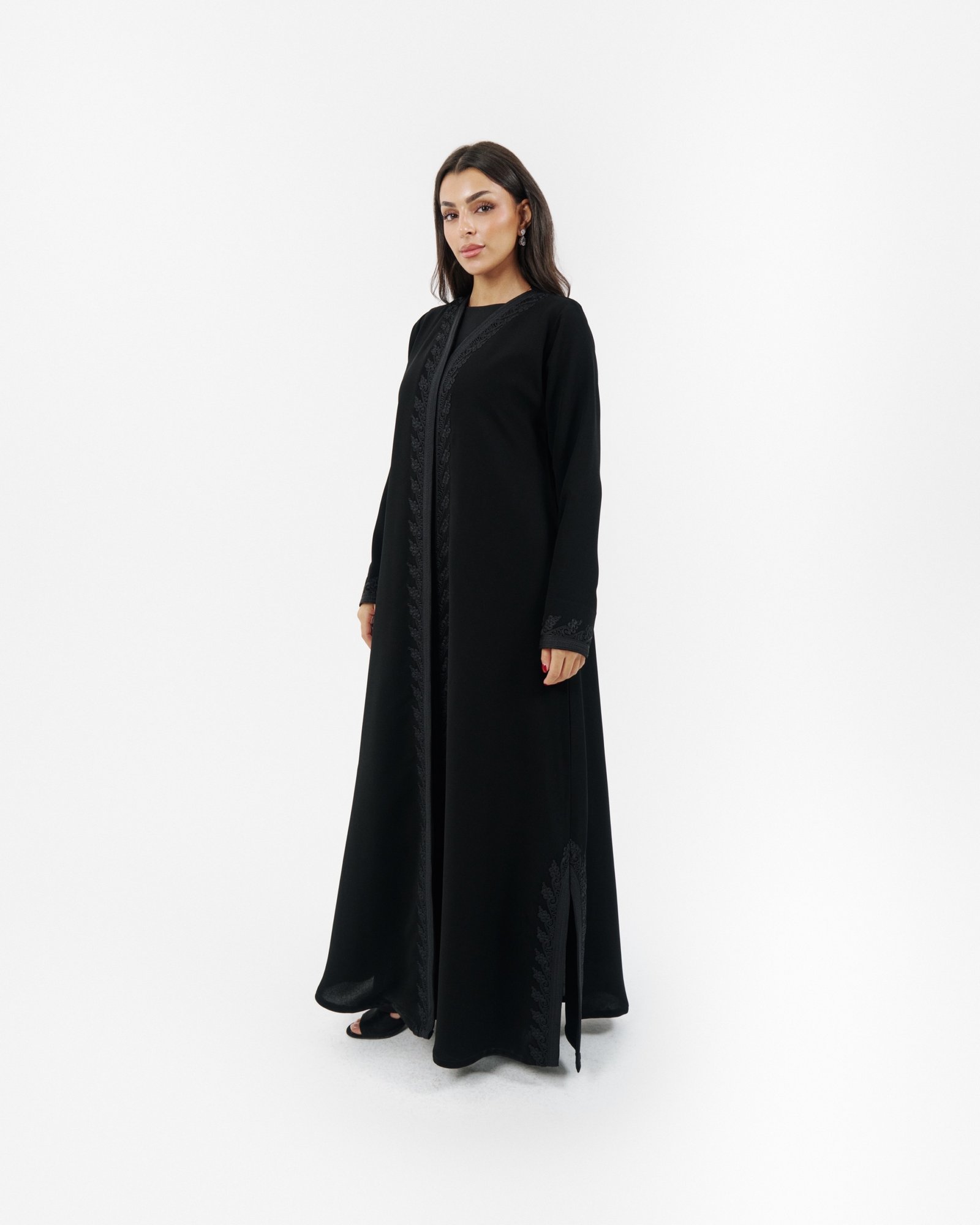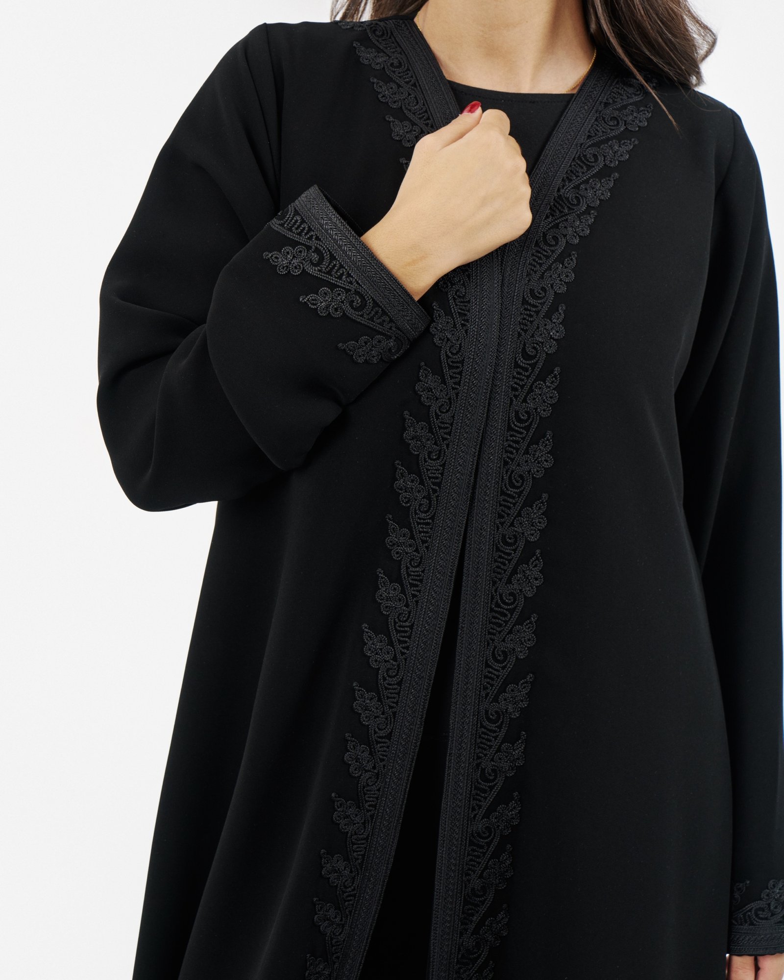 Black abaya with elegant handmade embroidery along the front and sleeves.